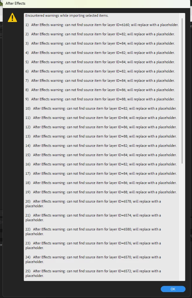 After effects Encountered errors while opening a project. 1) After Effecrs error: Error reading the text layer.Skipping the text layer