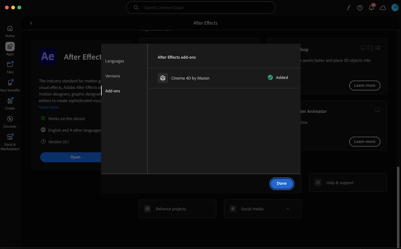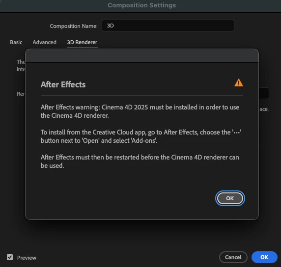 But when I try and access the Cinema 4D Addon via the composition setting menu it says the addon is not present.