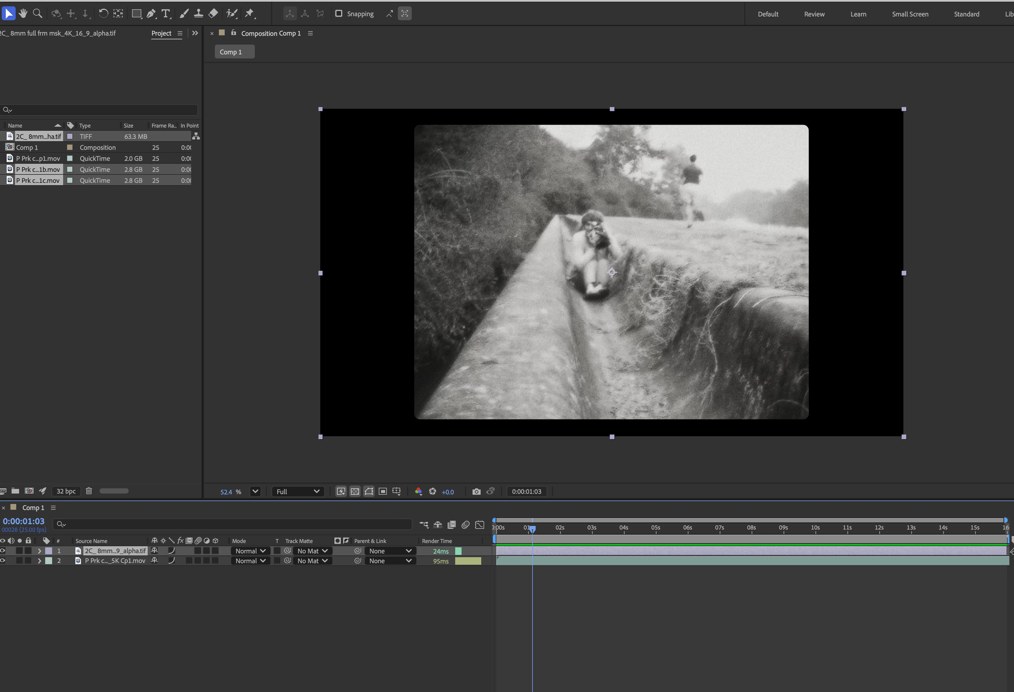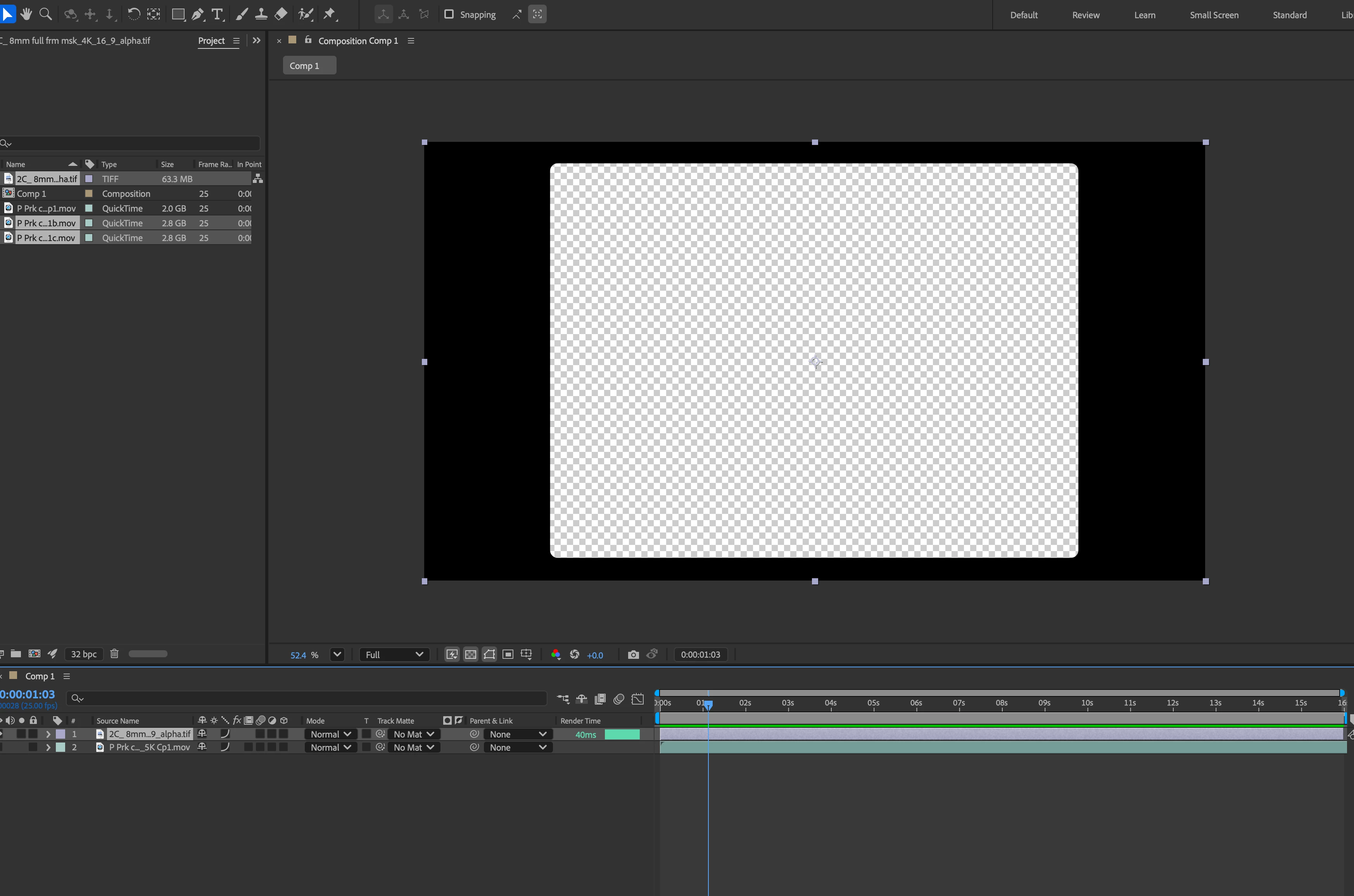 I am dropping a 2.5K clip in to a 4K 16.9 ratio project. On the upper layer I'm placing a PSD file with an alpha channel that acts as a film mask. The AE video project is 32bit with an RGB colour space. The PSD file is 16bit made in RGB. The option I choose when importing the PSD file is "Merge Layer Styles into Footage".