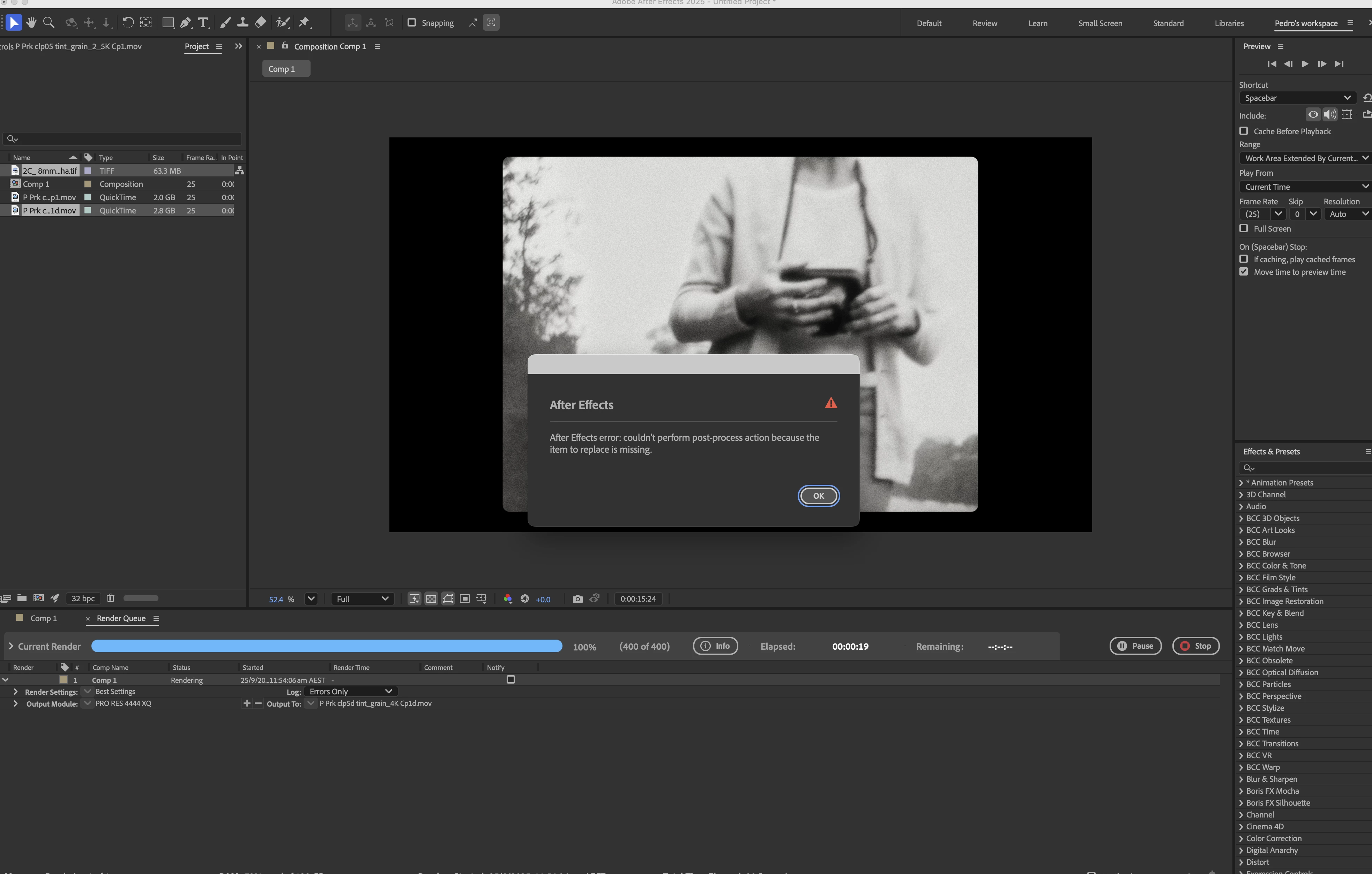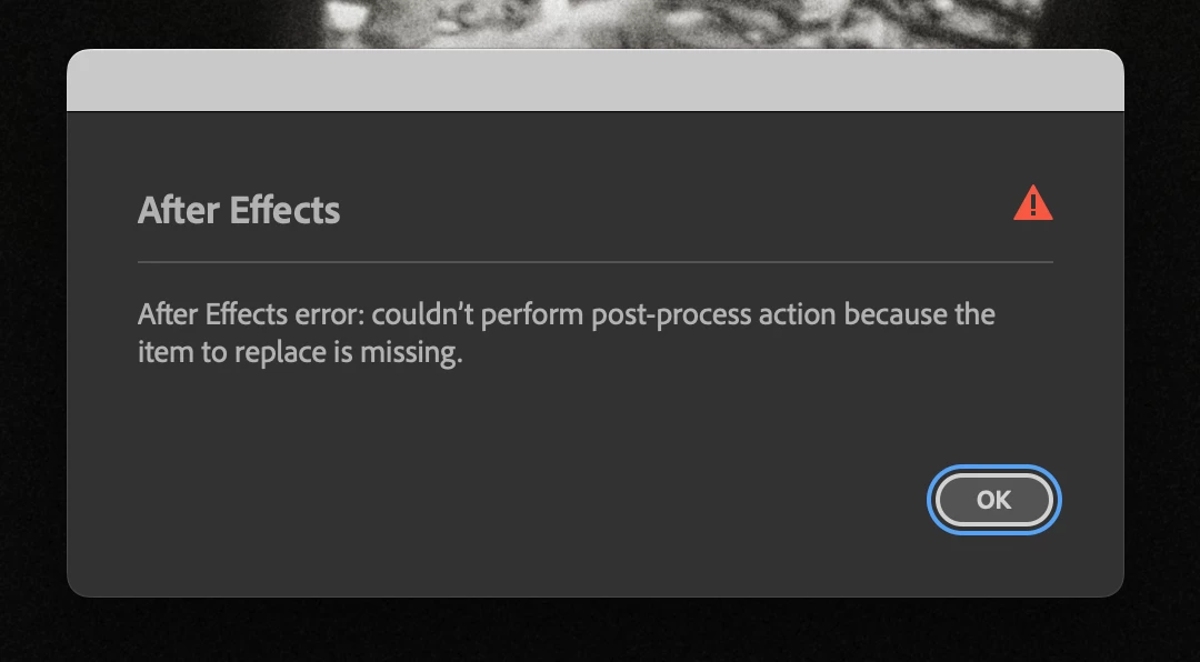 When rendering this or similar projects using a combination of PSD and Mov files, I invariably receive the following dialogue once rendering has completed. "After Effects Error: couldn't perform post-process action because the item to replace is missing". Now, I cannot see what item is missing as the clip renders normally. Can anyone tell me why I am receiving this message and how to get rid of it?