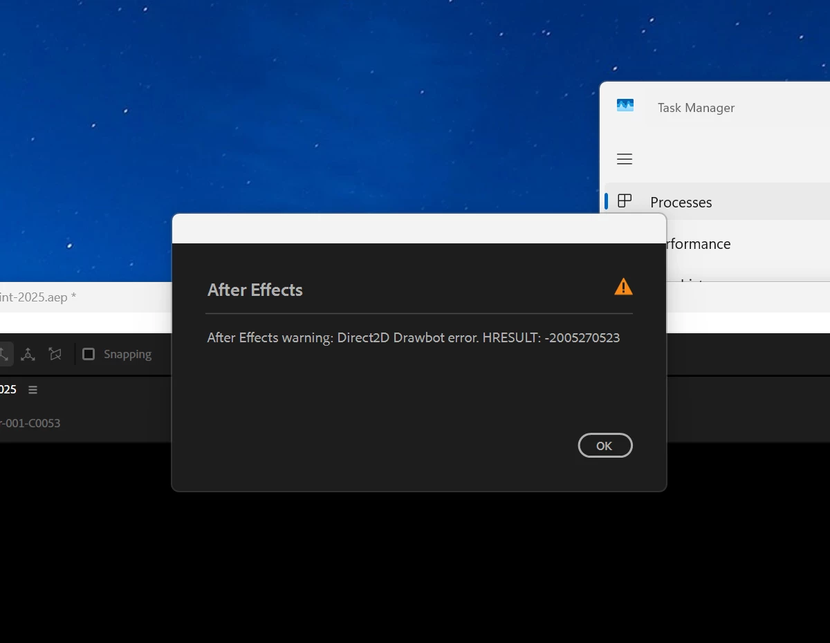 After Effects Freezes after some time with error: "Direct2D Drawbot Error. HRESULT:-2005270523"