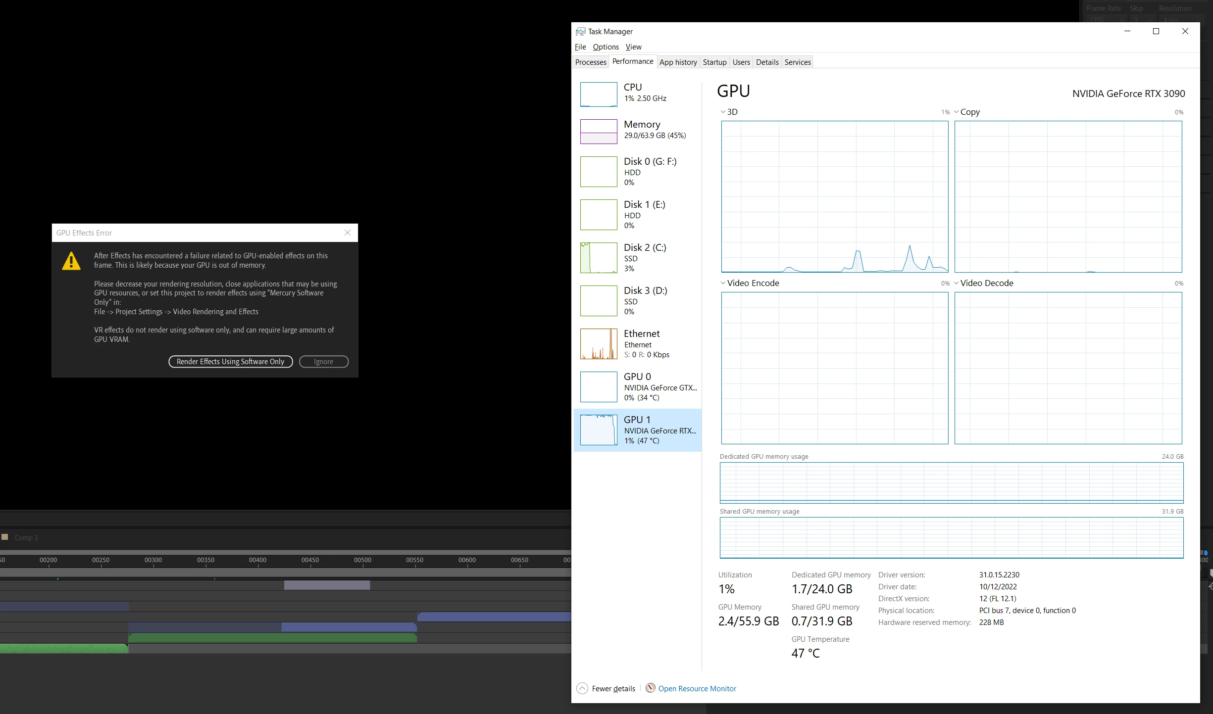 When rendering a preview for a simple .png or .exr 1280x1280 sequences comp, my GPU (RTX 3090), starts running at 100% for a while and getting no responds from AE. After a little bit of time after effect gives me the following message: GPU Effects Error.