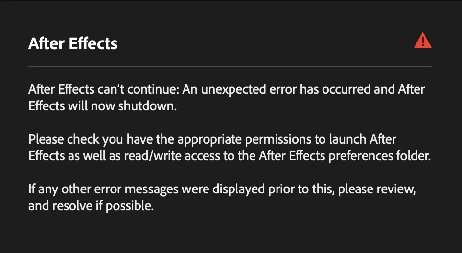 I recently updated my laptop to MacOS Tahoe and at the start AfterEffects was working fine until it crashed. Now every time I try to launch it I just get this message: