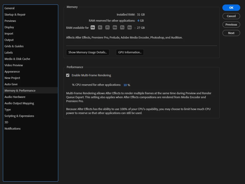 After Effects Not Using More Than 16GB RAM on a 32GB System (AE 2025)