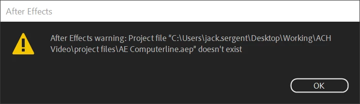 After Effects warning: Poject files doesnt exist