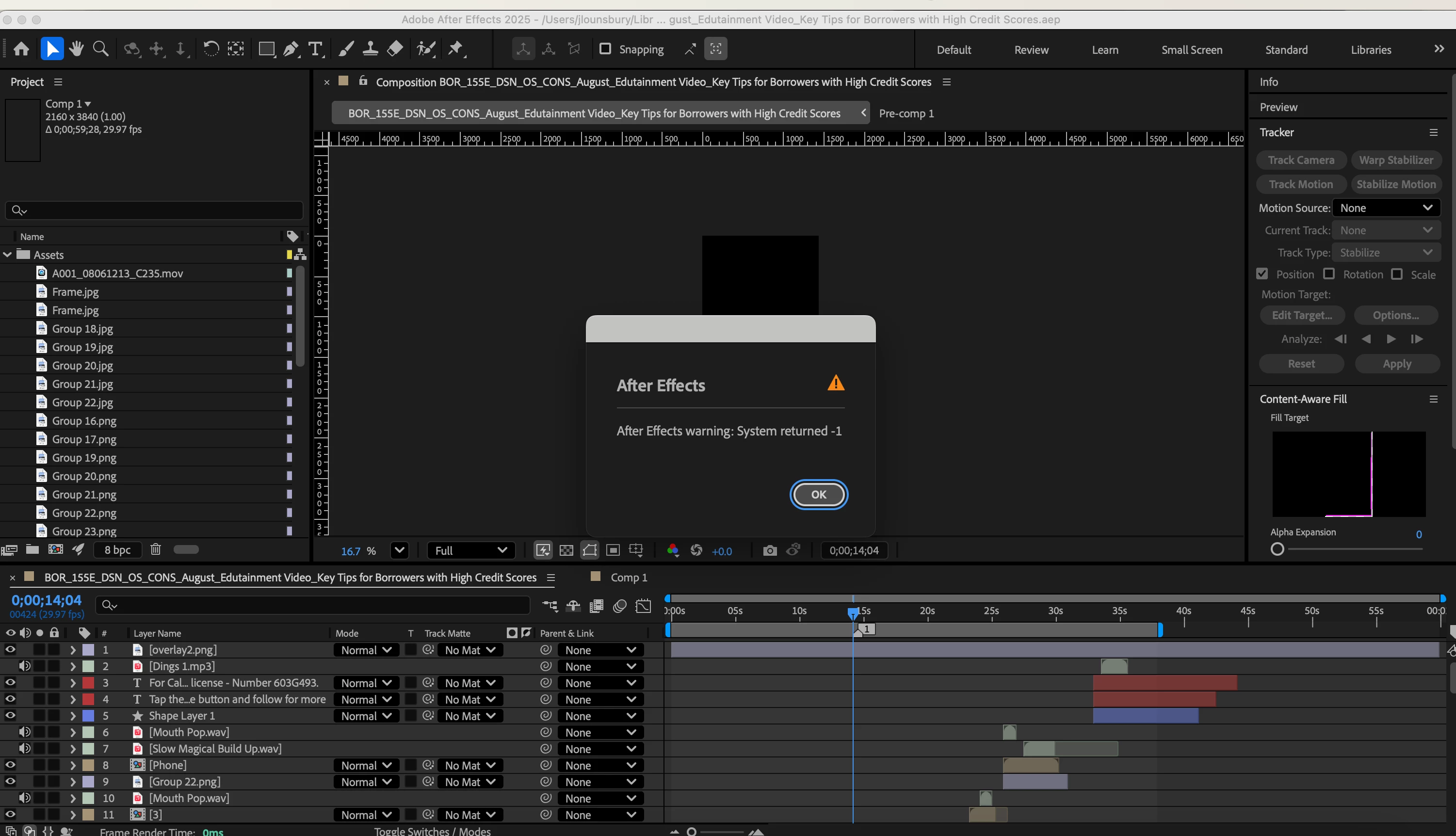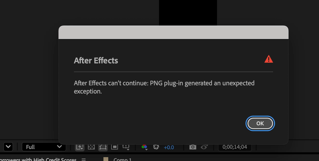 - Issue - I created a new comp within a file to play around with video color. When I clicked back to the original composition, I got the error as seen in the screenshot. I cannot continue, and am essentially forced to close AE. Opening that comp at all results in the same error.