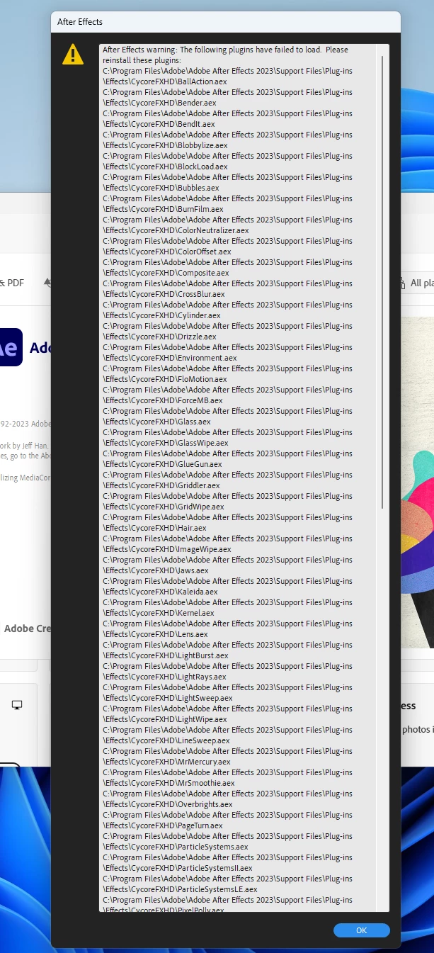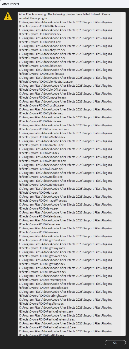 I am a user of the last 2024 version of After Effects, However, I need the 2023 version to test files and compatibility between both. That said, I installed the 2023 version (23.0), but when I launch it, it barrages me with a list of all the standard plugins AE can't see/find.
