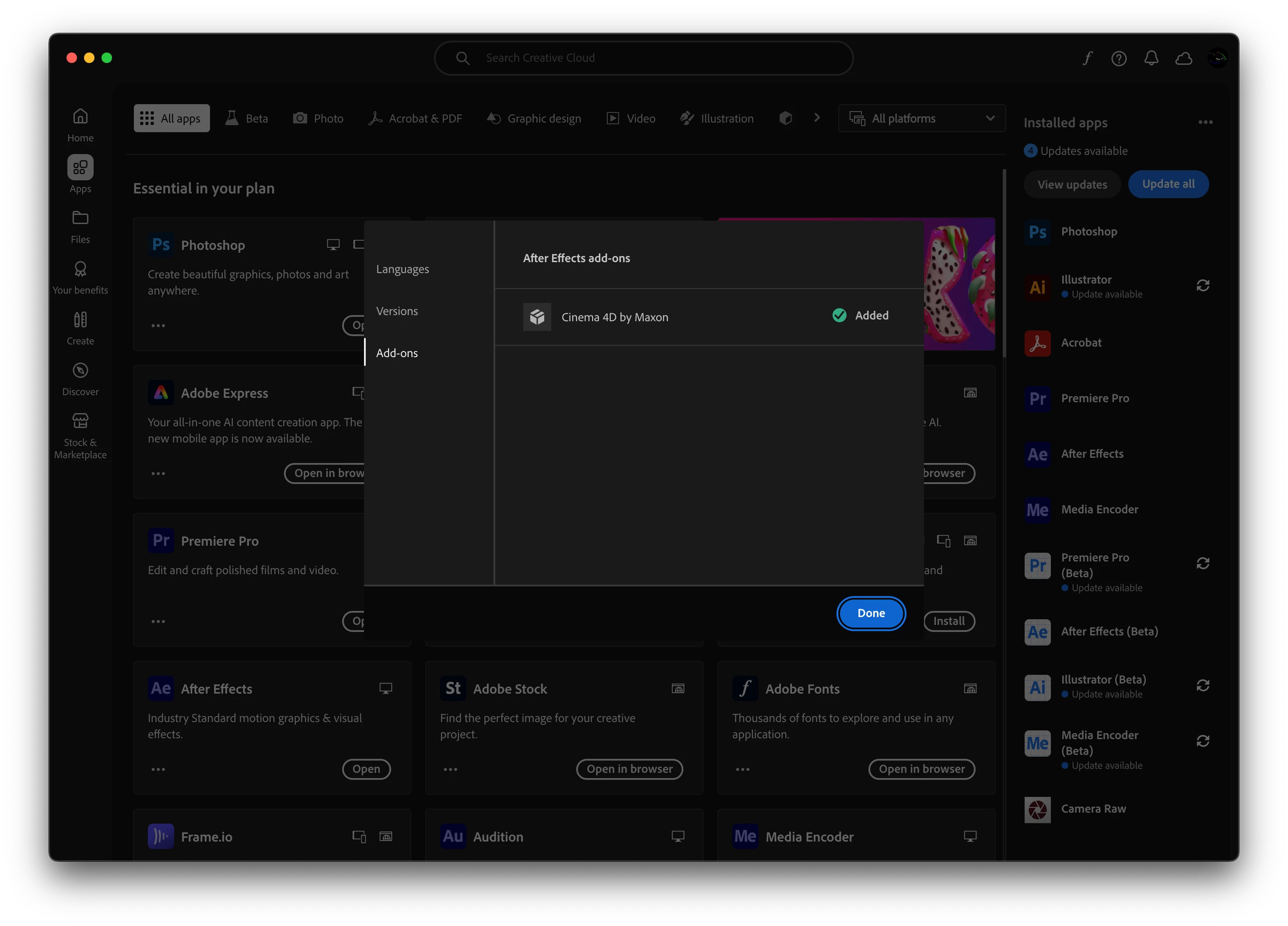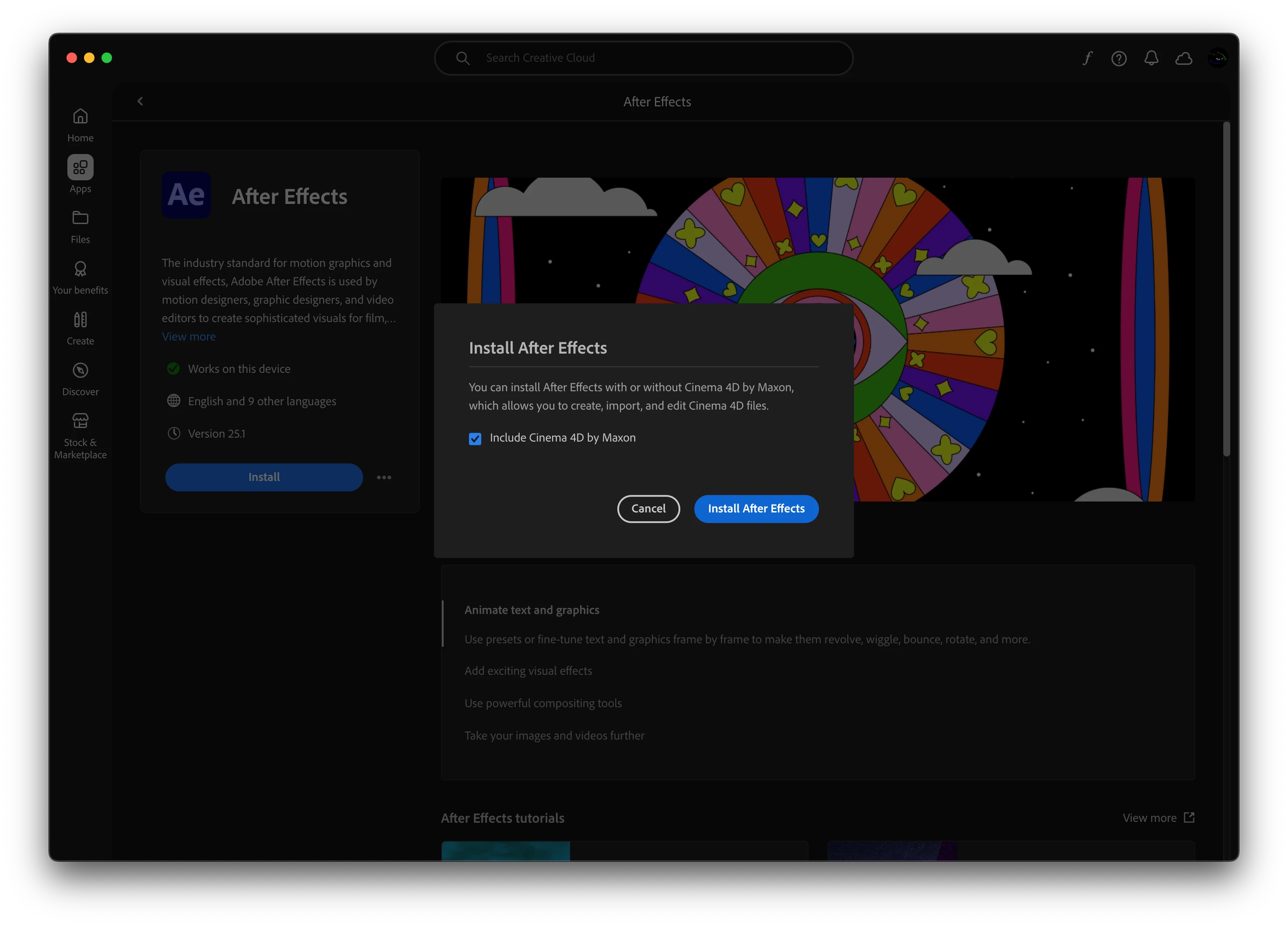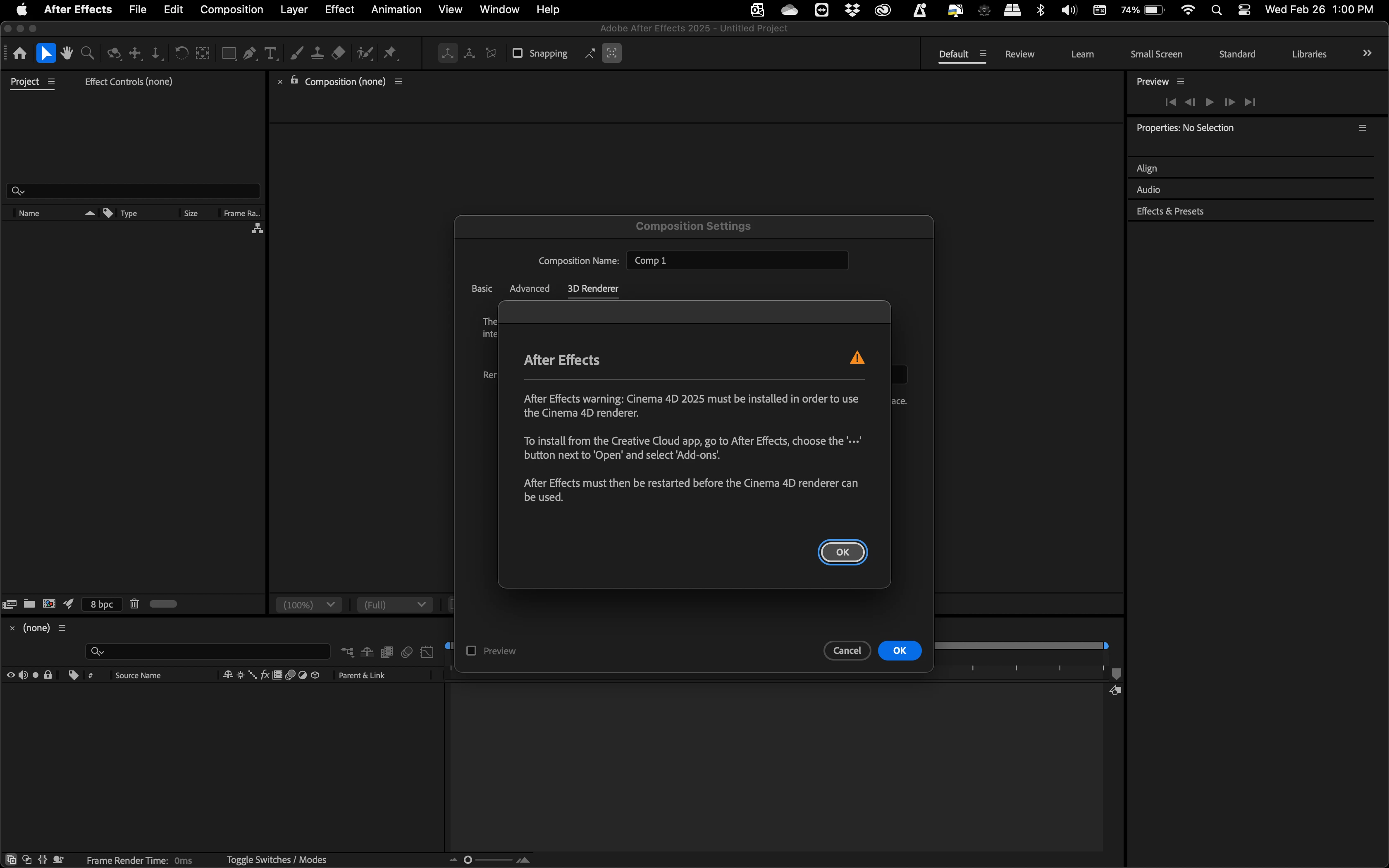 Estoy tratando de levantar mi composición con Cinema 4D render para poder darle volumen a los shapes pero me sale esta avertencia. Ya desintale y volvi a instalar y me sigue saliendo el mensaje.