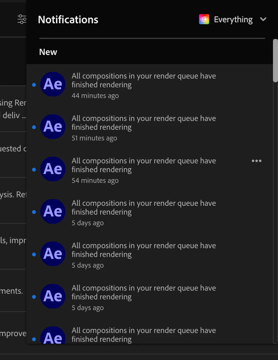 When I render any composition, Creative Cloud Desktop still pops a “Render Complete” notification even though I’ve disabled Render Queue notifications in Edit → Preferences → Notifications and turned off After Effects notifications in the Creative Cloud app.