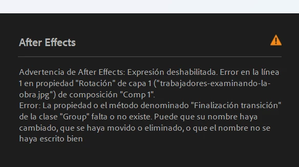 Hello, for a few hours now I have been experiencing a problem in which I get an expression error warning using the default expressions that the program brings. It all started today when I tried to open a project that included the Zoom - Rotate 2D expression and from then on I couldn't find a way to get it to work again. I have already uninstalled the program 3 times and nothing. I am attaching a video so you can see my problem.