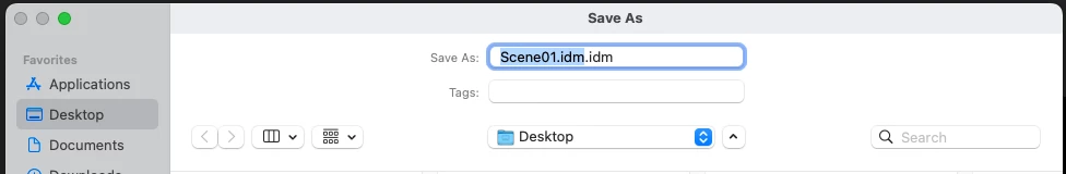 var file = new File(path).saveDlg();resulting in a default file name inside the opened file-picker dialog that contains a duplicated extension name: "Scene01.idm.idm" instead of just "Scene01.idm".