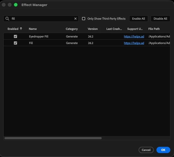 Issue : “Fill” effect and other miscellaneous pre-installed effects are entirely missing from the Effects Panel and “Manage Effects” window