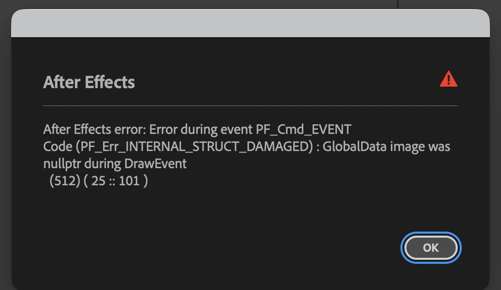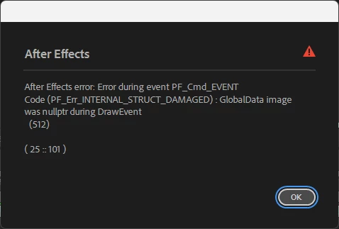 If instead I try right-clicking the .c4d file and select New Comp from Selection, I get the following error message first: "After Effects error: Error during event PF_Cmd_EVENT Code (PF_Err_INTERNAL_STRUCT_DAMAGED) : GlobalData image was nullptr during DrawEvent