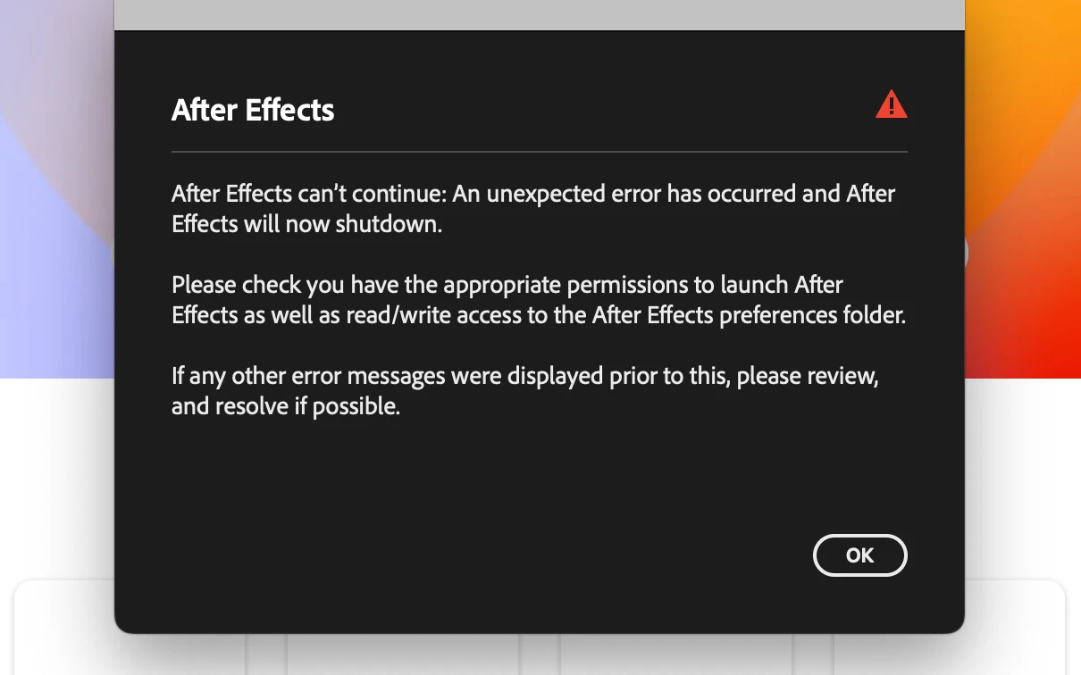 Every time I open After Effects, two error windows immediately pop up, and then the program shuts down automatically. I've already tried reinstalling it, but the issue still persists. Could you please help me solve this problem? Thank you. (QQ!!)