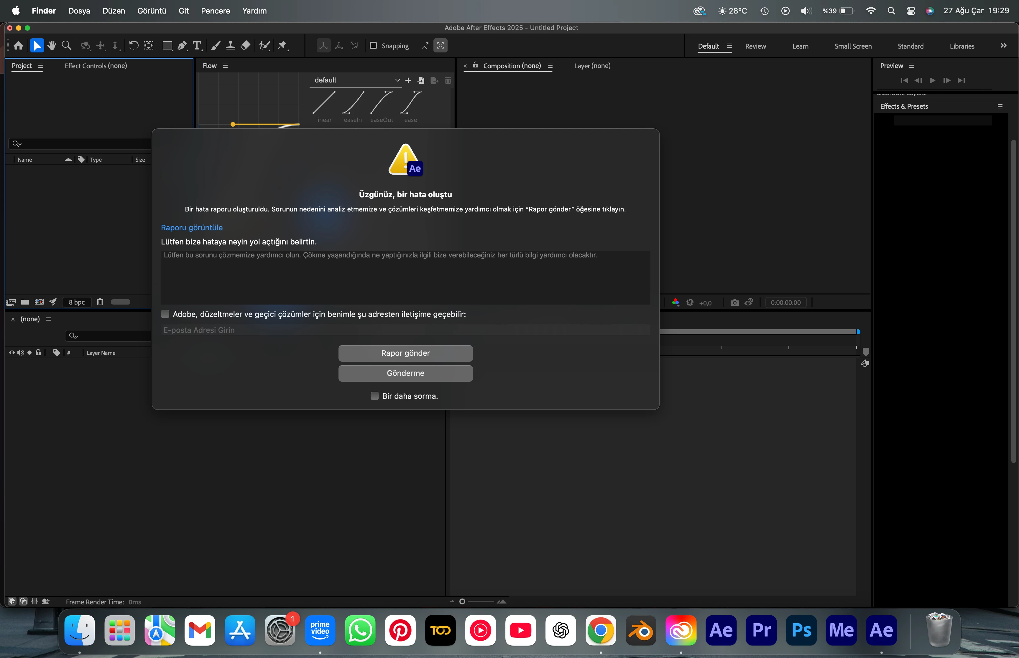 After the error occurred, I tried to exit but couldn't, and Ae's error message said that 3D part plugins were the root cause of the problem. Frankly, I don't know what to do, but I've already spent over 25 hours on this project and still have a long way to go.