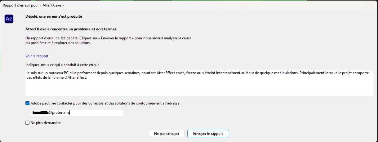 J'ai envoyé un rapport d'erreur avec mon adresse mail après un crash.