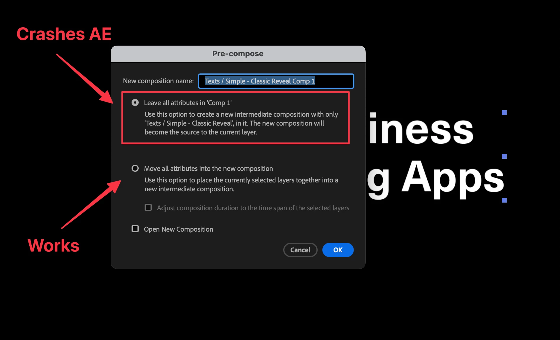 Creating a new precomp of items with (some) Essential properties is causing AE to crash