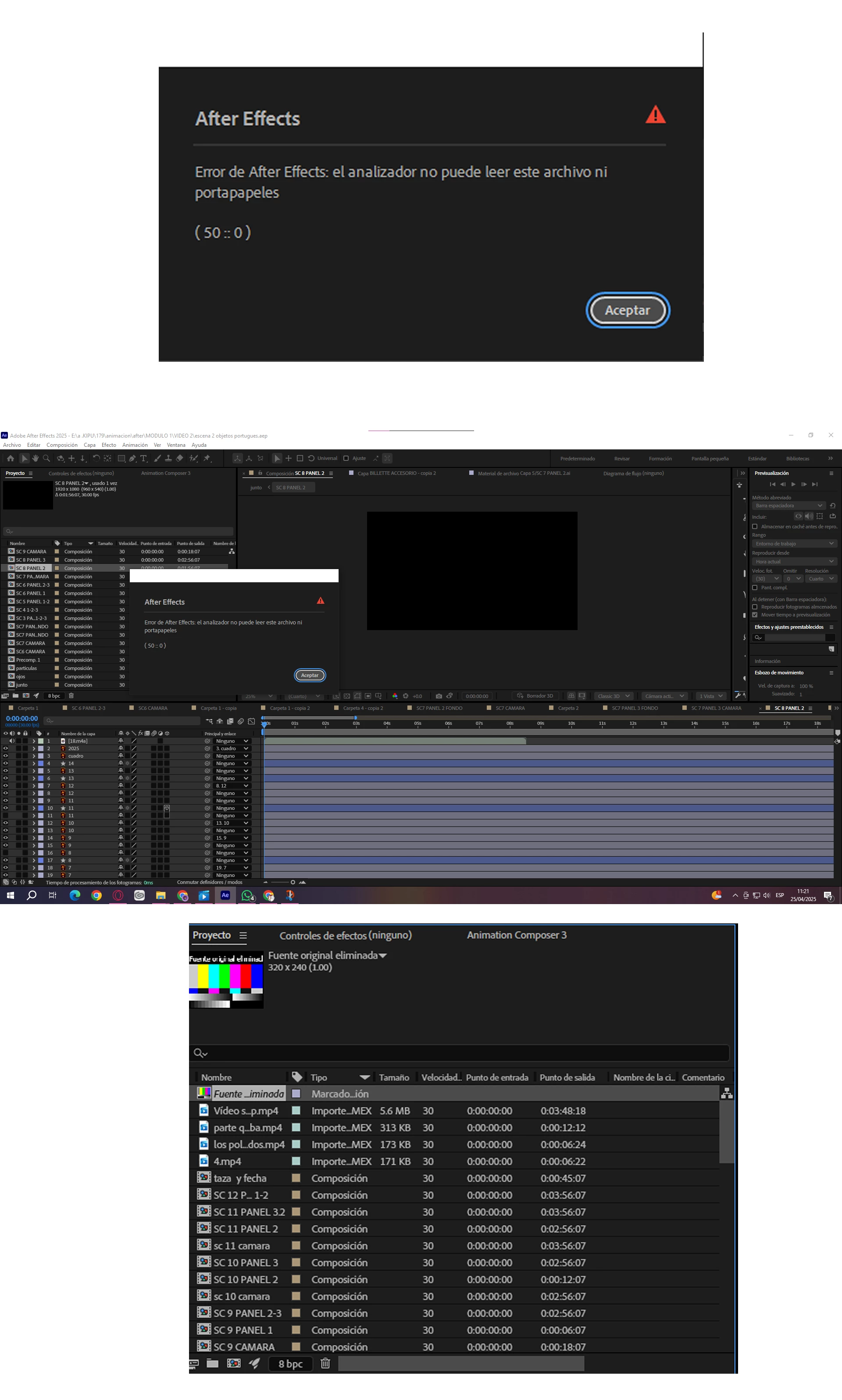 Todas las composiciones usan los mismos recursos: imágenes de Adobe Illustrator, archivos de audio y Animation Composer, así que no entiendo por qué ocurre esto. En la tercera captura se puede ver que solo falta un archivo, pero no estoy segura si eso es lo que está causando el problema. Agradecería mucho su ayuda con esto.