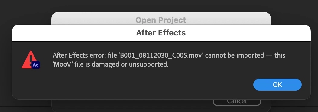 I updated all my Adobe apps as I was between projects, then got a request from my client to update a project created a few months ago. After downloading the collected project from Dropbox I tried opening it in the latest 23.0.0 build of After Effects. Every single embedded .MOV file gave an error "this MooV file is damaged or unsupported." I rebooted, etc and nothing worked, having to repeatedly click OK for the dozens of footage files over and over. Tried reimporting but the same error.