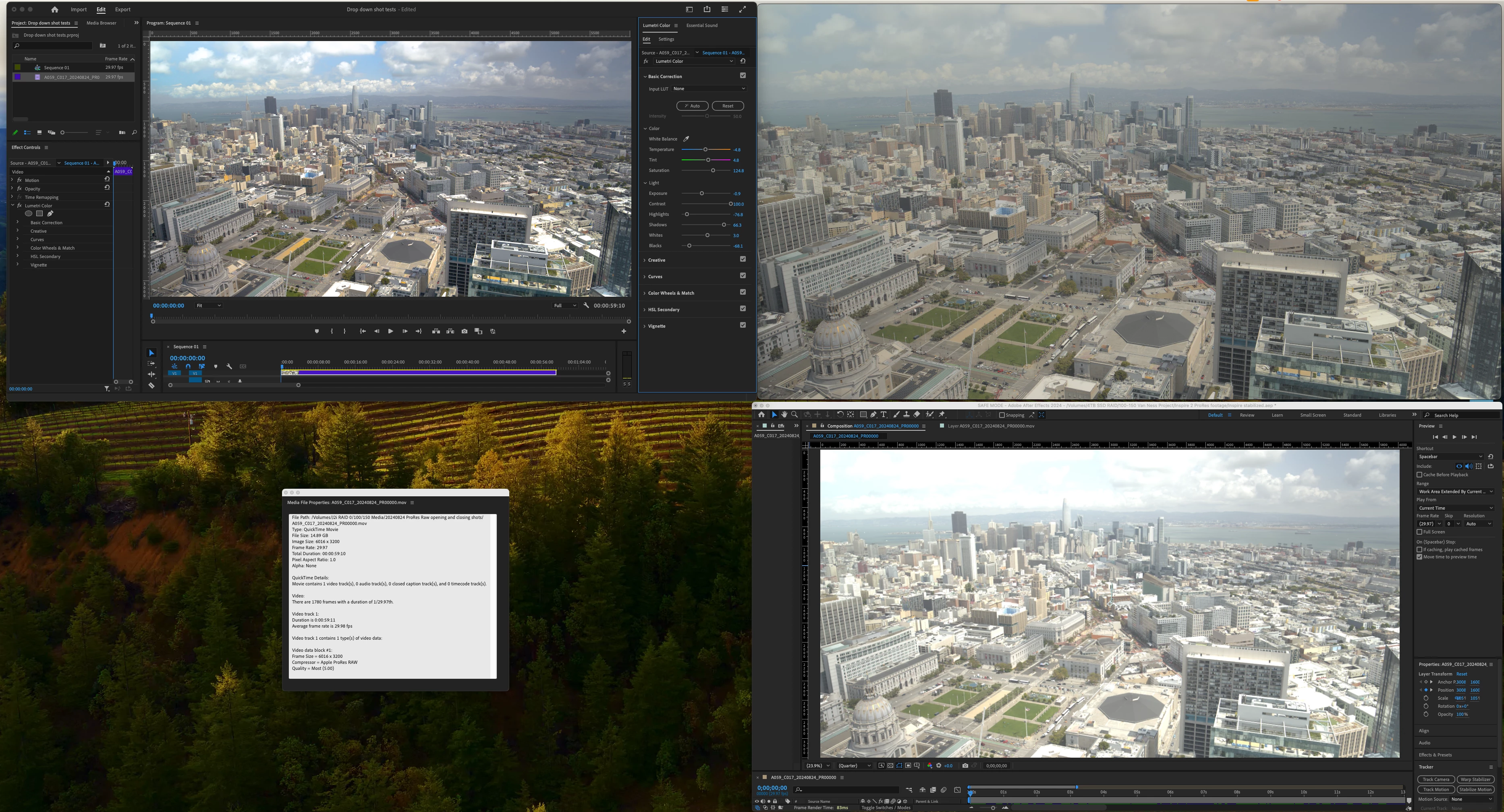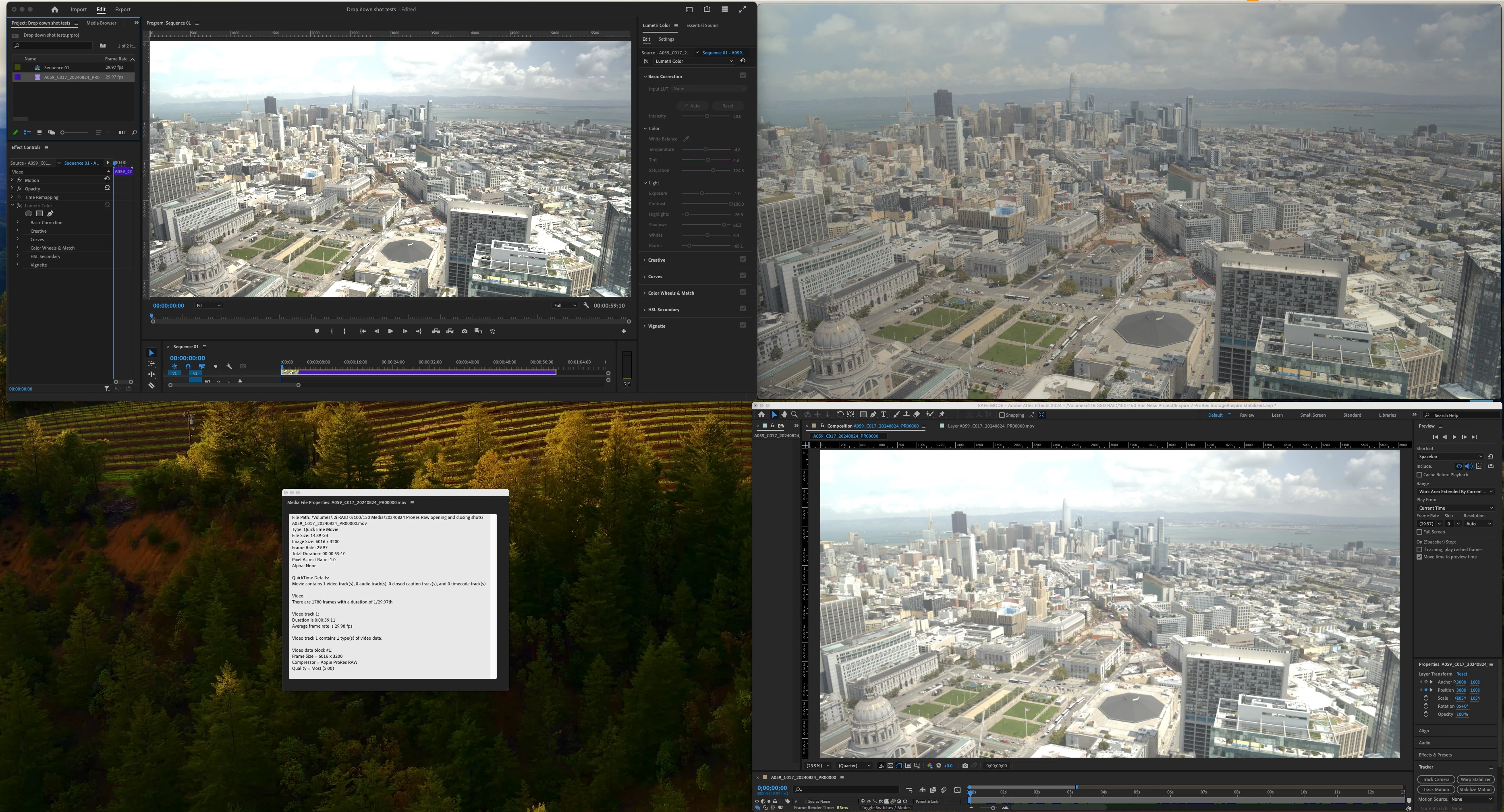 There are two images attached. In the layout of the two images, Premiere Pro is in the top left, Quicktime player top right, file properties bottom left, and After Effects bottom right. One screen capture shows the video corrected in Premiere Pro (top left quadrant), and the other shows the video in Premiere Pro without any correction (top left quadrant).