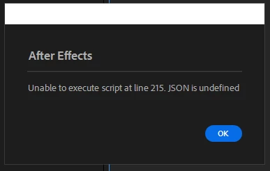 AAlex FreedomroadParticipantForum|Forum|5 months agoAugust 23, 2025Script .jsxbinForum|Forum|5 months agoAugust 23, 20252 replies218 viewsI can't open the script Animated Typeface.jsxbin in the latest version of After Effects 25.4. However in the version 24.6.8 I was able to open the script. The message that appear says: Unable to execute script at line 215. JSON is undefined. Scripting