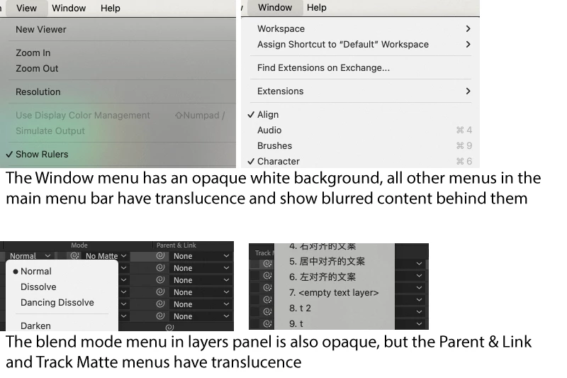 After upgrading to macOS sonoma, I found that the Window menu and blend mode menu are not transparent. The following screenshots are taken on Sonoma 14.1.1 (23B81) and After Effects 24.0.3 (Build 2).