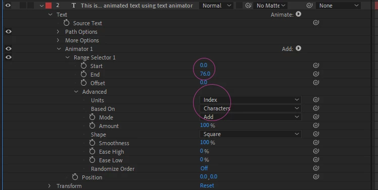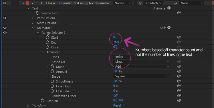 Before the recent updates, the 'Range Selector' would update based on what type of 'Unit' was selected when adding a 'Position Animator' on text. For example, when adding a 'Position Animator' and selecting 'Index', the 'Range Selector' 'Start' 'End' would default to the number of 'Characters' in the text. If 'Based On' was changed to 'Lines' (for example), the 'Range Selector' 'Start' 'End' numbers would unpdate to the number of lines in the text. This is no longer the case. The 'Range Selector' 'Start' 'End' remains on the character count or, whichever 'Based On' option was selected prior to selecting the 'Units' option. It no longer updates.