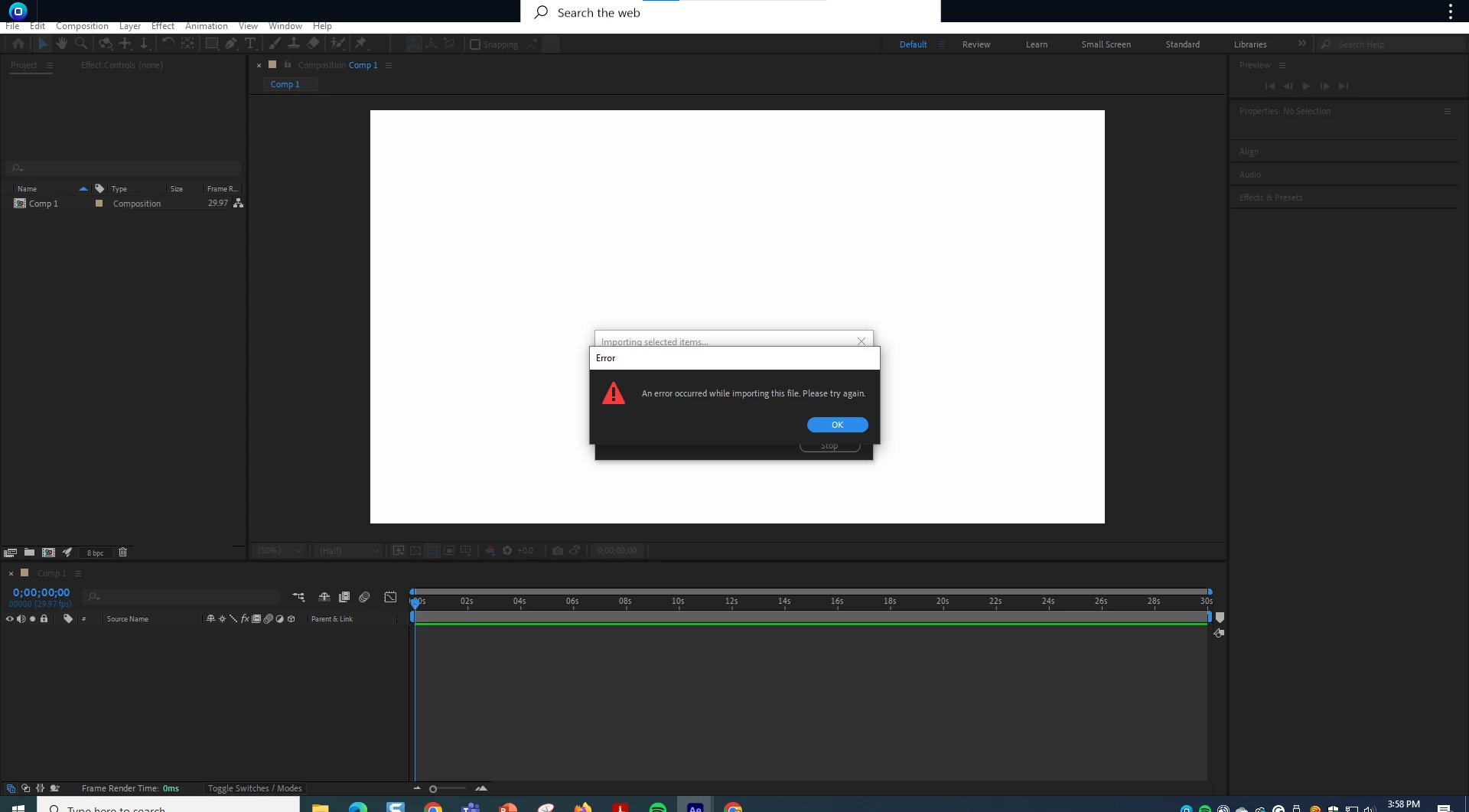 Ae tries to import the .FLA file for around 30 seconds before bringing up a box with this error message every time. (I've attached a screen shot).