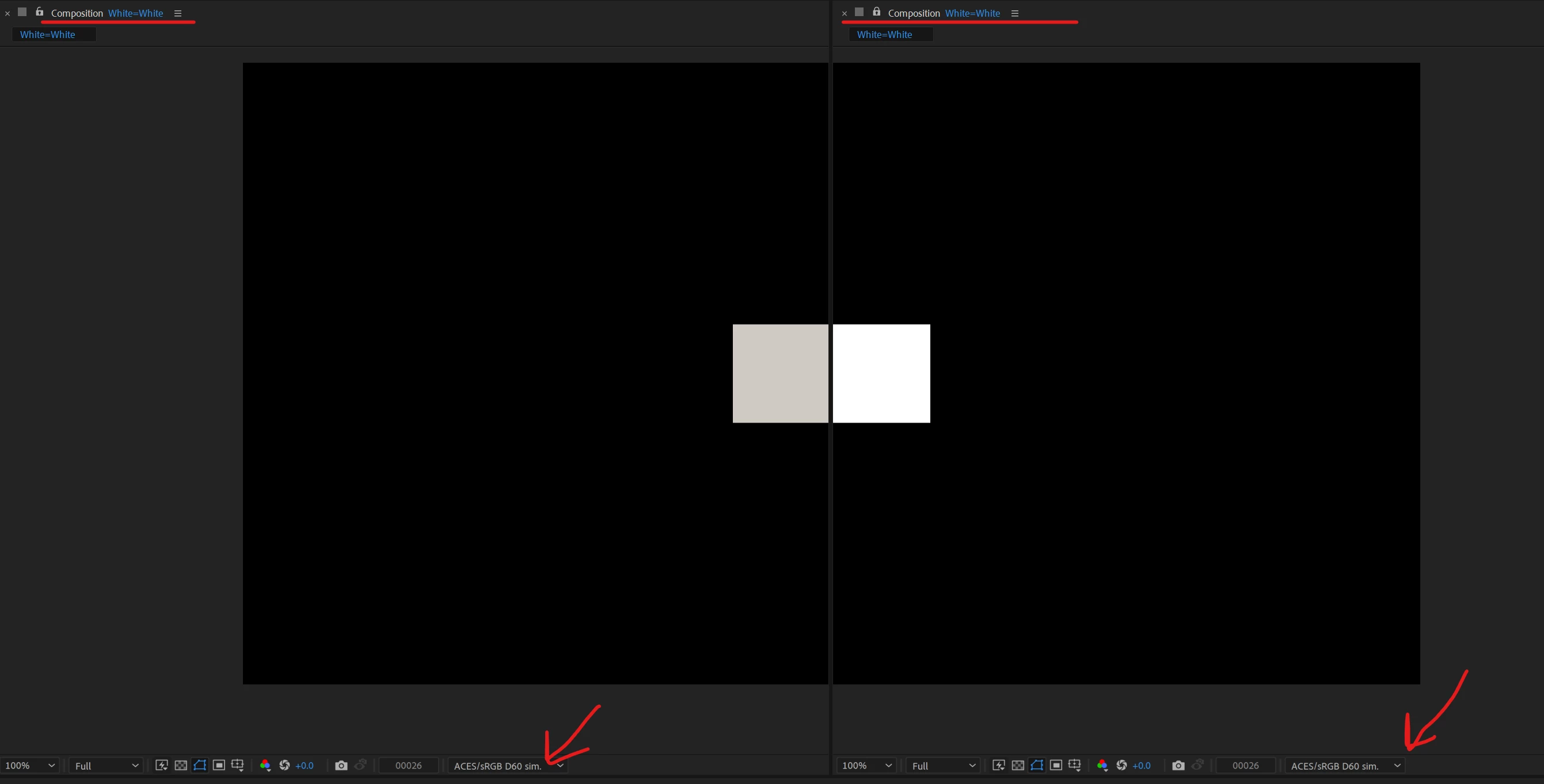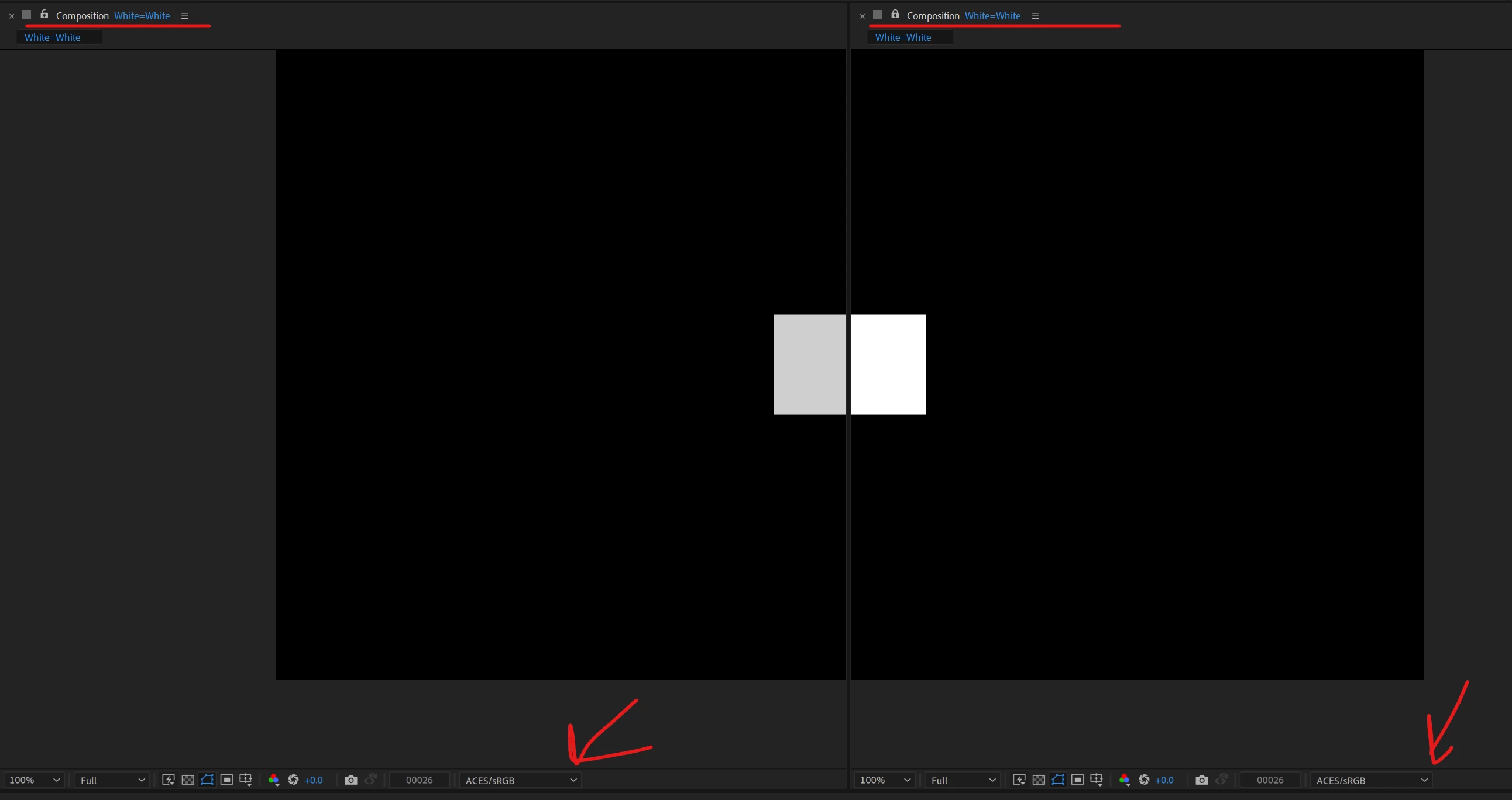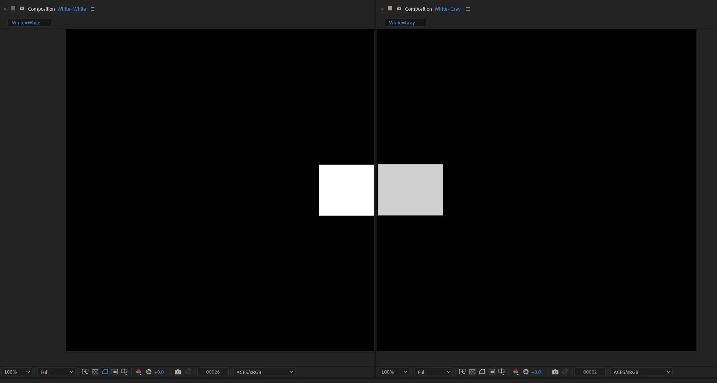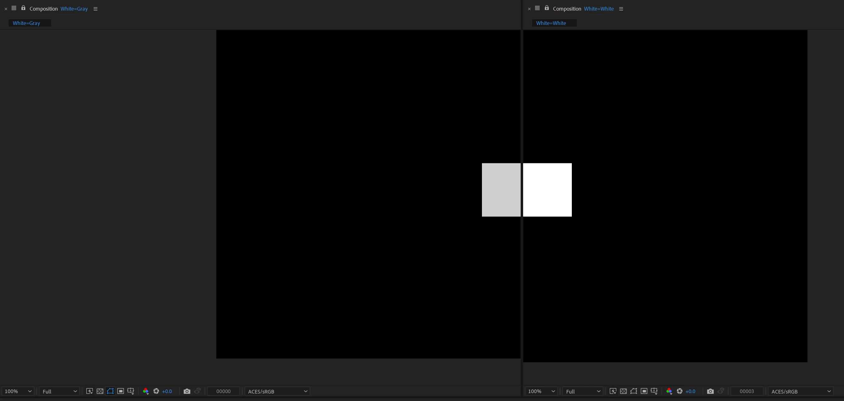 See attached AE file. The project settings are using ACES. However, the two comps in this project treat white differently, and I am using the same display transforms. I have noticed that comps will randomly start interpretting FFFFFF hex values incorrectly. Currently the only workaround that I am aware of is to duplicate the comp that works. I don't know what triggers this bad result to happen. Any advice?