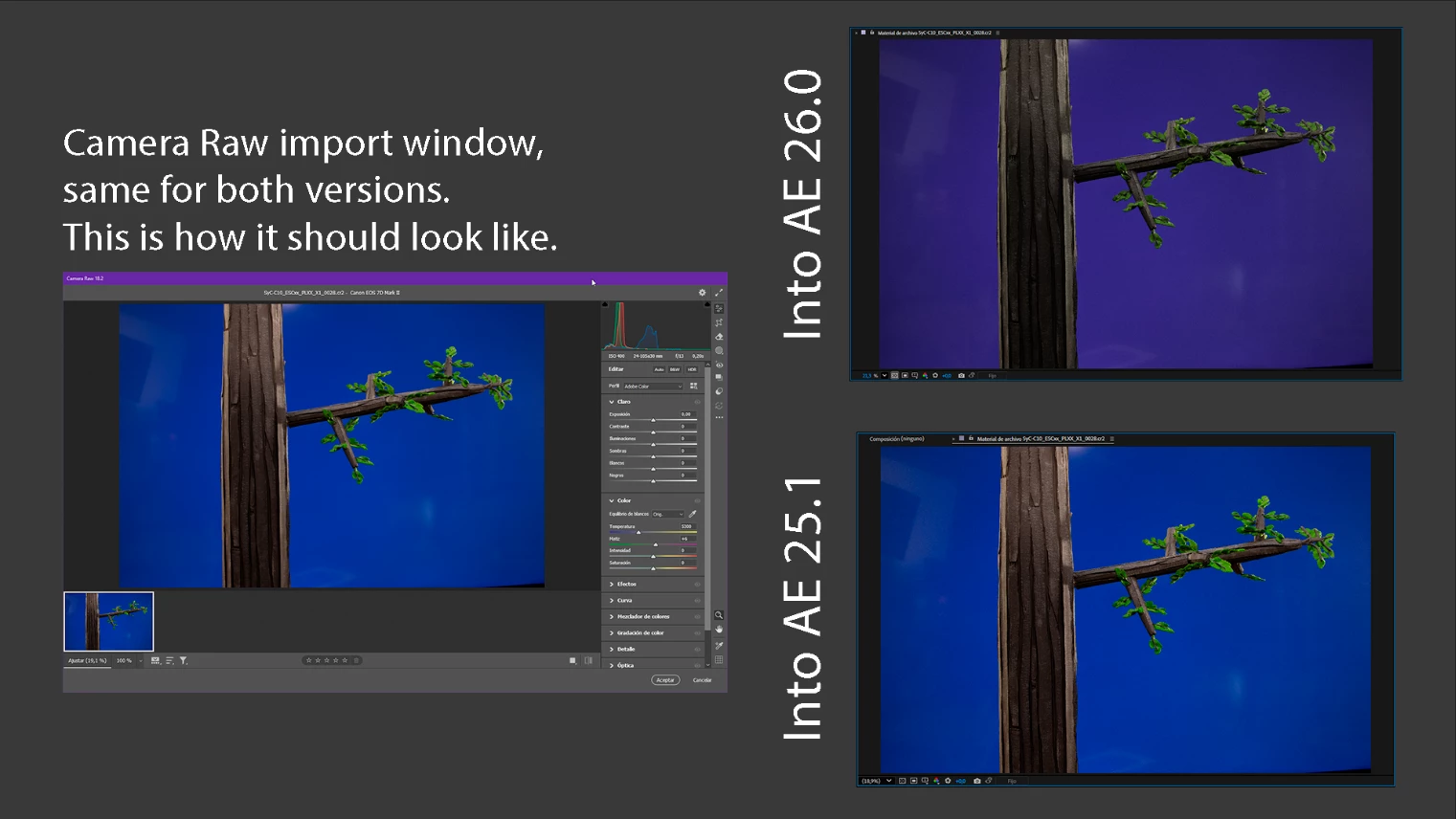 Hi. I work in post. We usually import an image sequence of cr2 / raw footage into After Effects, it shows a preview on the Camera Raw window, where we leave everything as it is by default, with Adobe Color profile.