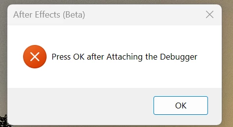 I'm facing an error with After Effect beta & Media Encoder beta. When I opened the application, I immediately encountered the text Press OK after Attaching the Debugger (Image attached below).