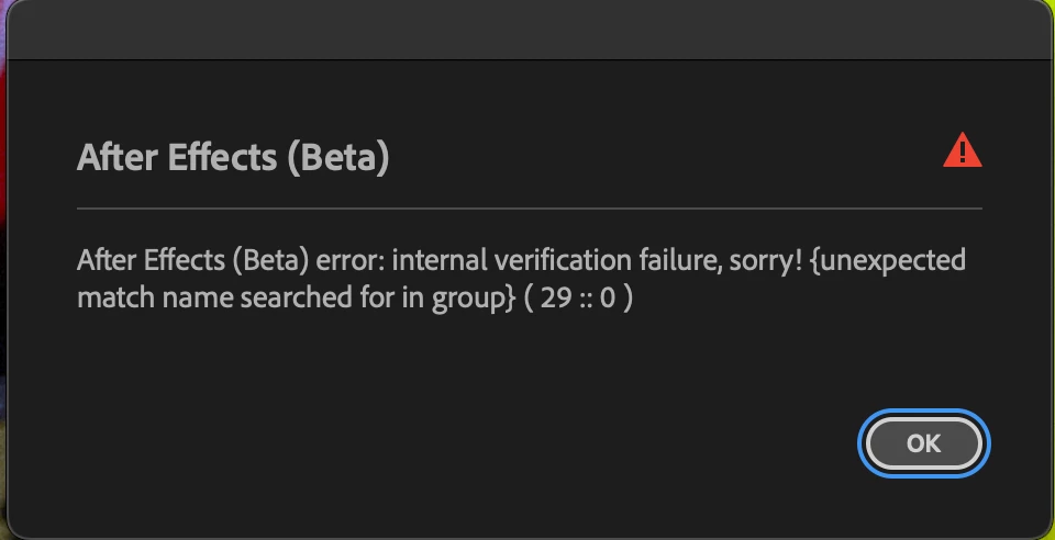 After Effects (Beta) error: internal verification failure, sorry! {unexpected match name searched for in group} (29 :