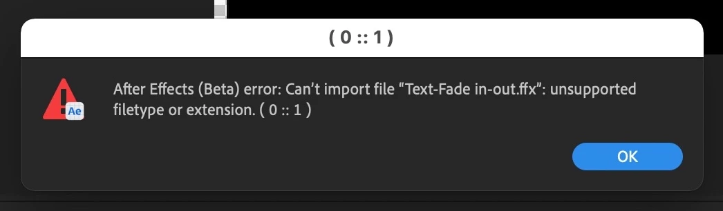 "After Effects (Beta) error: Can't import file "Text-Fade in-out.ffx": unsupported filetype or extension. ( 0:: 1)