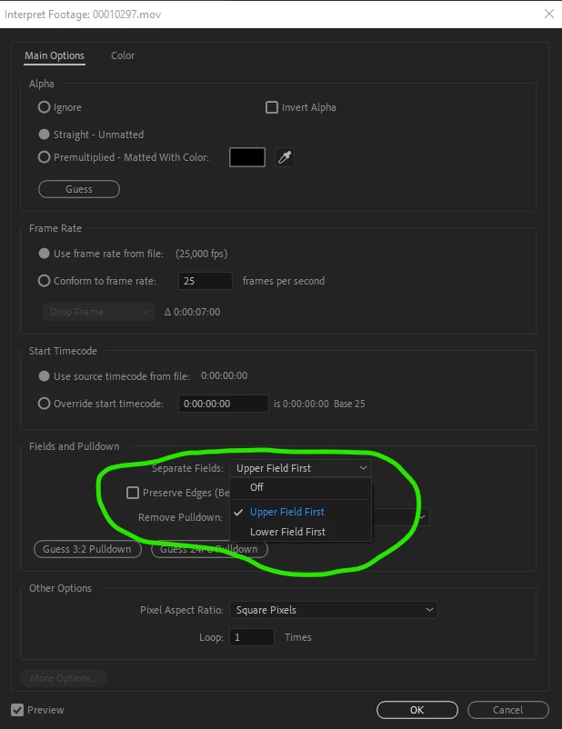 Interpret Footage "Upper-" and "Lower Field First" shows identical field