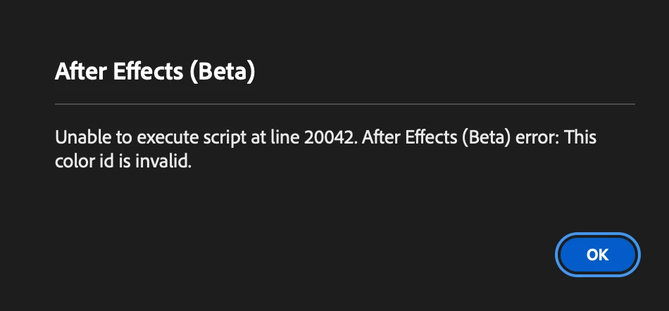 Unable to execute script at line 20042. After Effects (Beta) error: This color id is invalid.