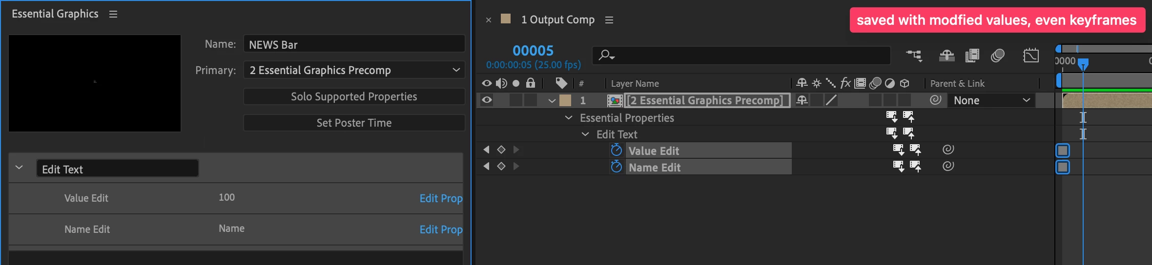 I have the source text hooked up via Essential Graphics. Just having them as single entries within the Essential Graphics Panel. I put that comp in another comp and change the text / values and create keys to be super save. Now I save the comp and reopen it: All good.
