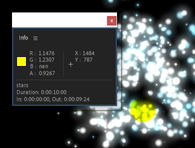 I'm using (an older version of) Trapcode Particular to create some stars forming a logo. I've coloured the particles from a gradient ramp with completely normal (not over 1,1,1) colours, which range from a light cyan to white - no yellow at all. Weirdly, one clump of particles (I have no other effects on the layer other than Particular) renders as yellow, and if I look at its RGB values, the blue is "nan", which I've never seen before. My project is 32 bit, set to "Adobe Color Managed" (I also tried some of the OCIO options, but it made no difference to the Area of Weirdness):