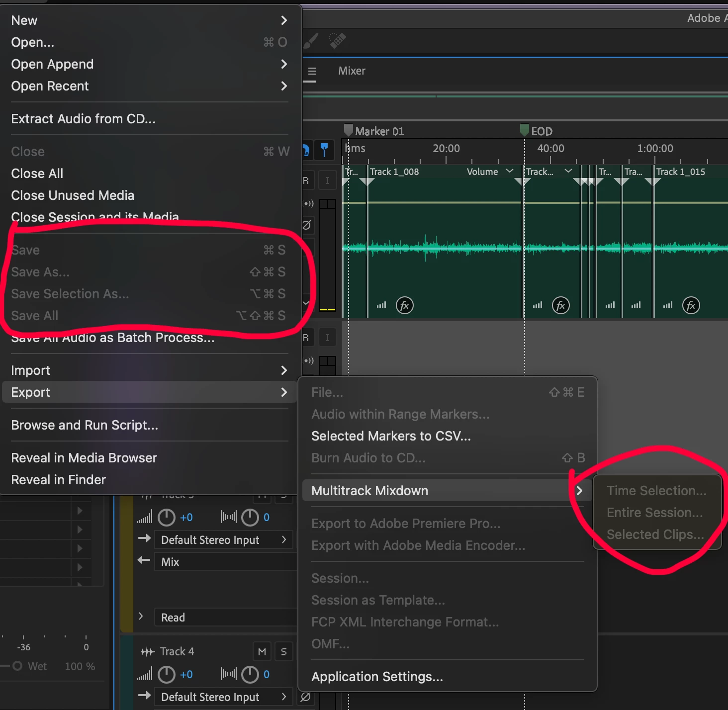 I'm working on a project that requires me to record a lot of voice over. I have about 2 and half-ish hours of audio recorded for this, and now for some reason Audition won't let me save or export it. The options are greyed out, and it won't allow me to save using Command + S either. I'm wondering if it's an issue of how big the project file is, or some type of other error.