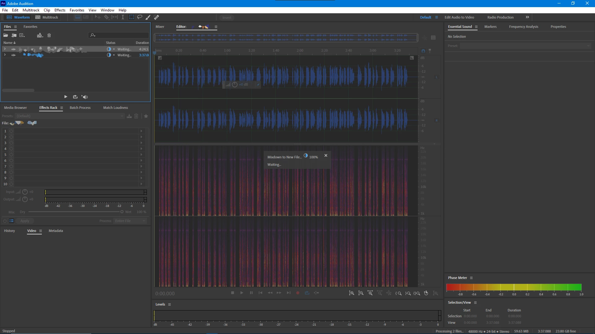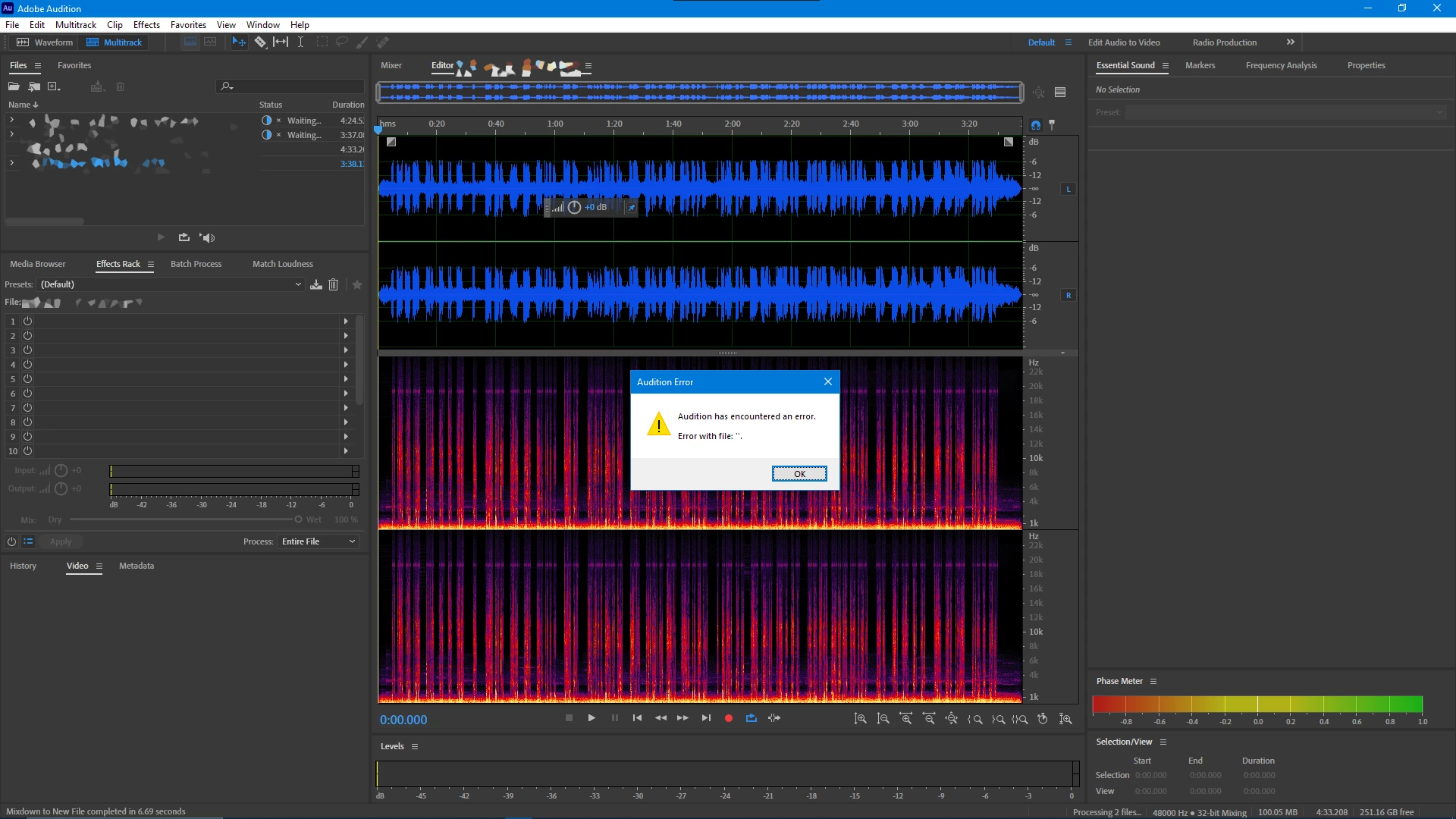 The files used in the multitrack then appear as if they are being worked on, and the waiting symbol appears indefinitely stuck at 100%. The files are unable to be closed or edited in Timeline view, I have to quit the app fully. So far it appears as if the files are rendering correctly before throwing the error.