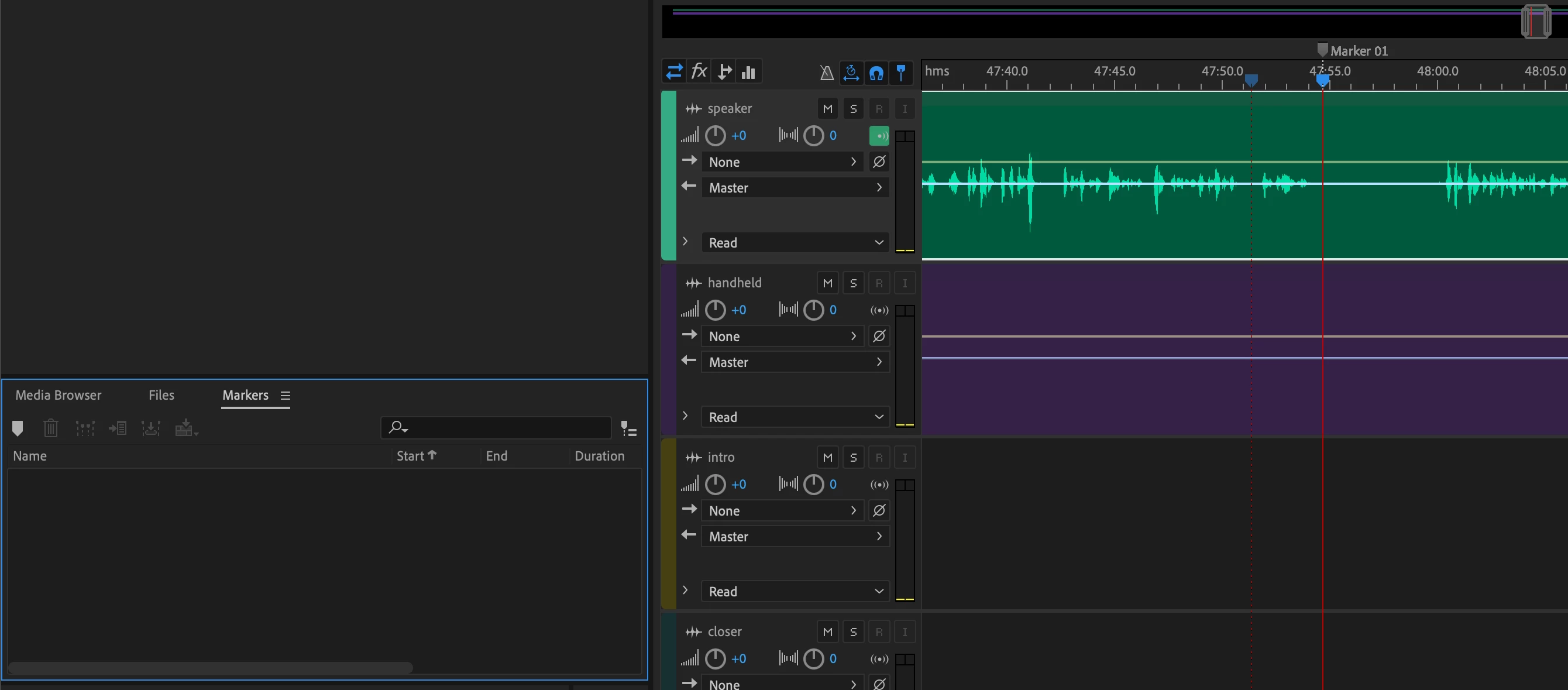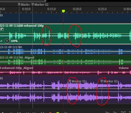 On the green track are two markers with no marker numbers on them. On the purple track are two named markers. The markers with the vertical lines covering the whole track field are session markers, but there are also two markers on the green track (all these track markers are ringed in red) and they don't have track numbers, even though they clearly do: