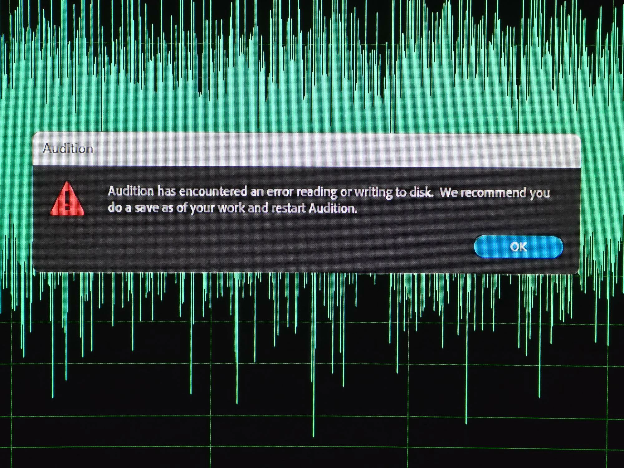 I have recorded 12 & 45 minute voice overs files for a documentary. I also recorded a test today. It was fine for a few minutes, then I got the same error message I have attached. It appears the waveform is there, but there is no sound. I pulled the file up in another DAW, WAV or MP3, and the audio is gone. In another DAW thee waveform has vanished. The wave in flat. It played back just fine last night when I saved and closed out.