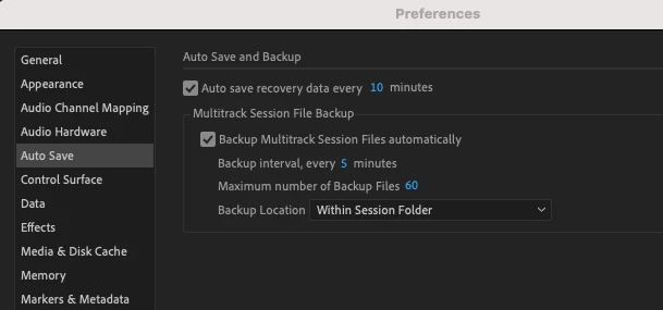 Also I'm working on another multitrack today and I've been keeping an eye on the backup folder to see if any are being made, and it looks like I'm having the same issue. I've also tested if the autosave works and, again, it isn't autosaving every 10 mins. When I manually save I can see the file update, but that is the only time something happens.