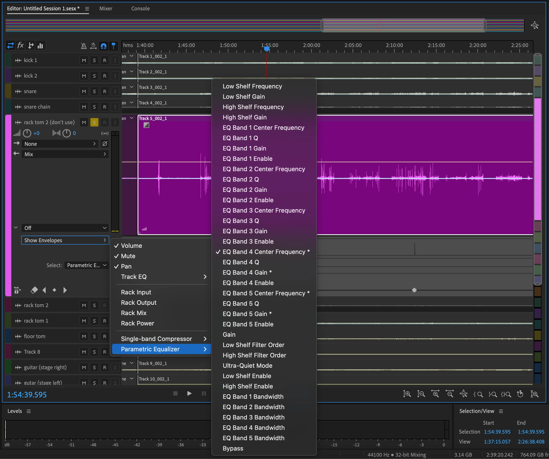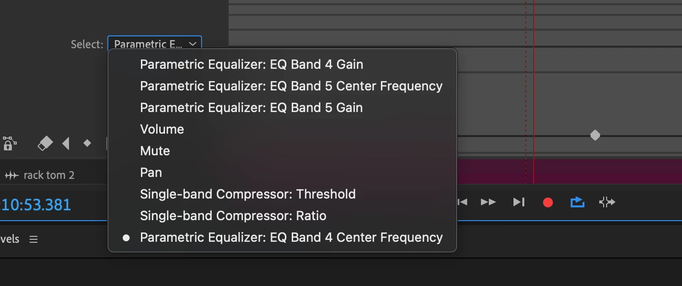 Anyway, I "fixed" this (though it was my perception that was broken) by expanding the track so that the "Show Envelopes" dropdown appeared, then I clicked Show Envelopes > Parametric Equalizer (Fig. 1), then made sure there was a checkmark next to all the effects with astrisks (*) next to them, e.g. EQ Band 4 Center Frequency *. That way I could now see what automation is actually taking place, then Select > Parametric Equalizer: EQ Band 4 Center Frequency (Fig. 2), then delete those keyframes, using the "Clear All Keyframes" eraser button (Fig. 3). See images below.