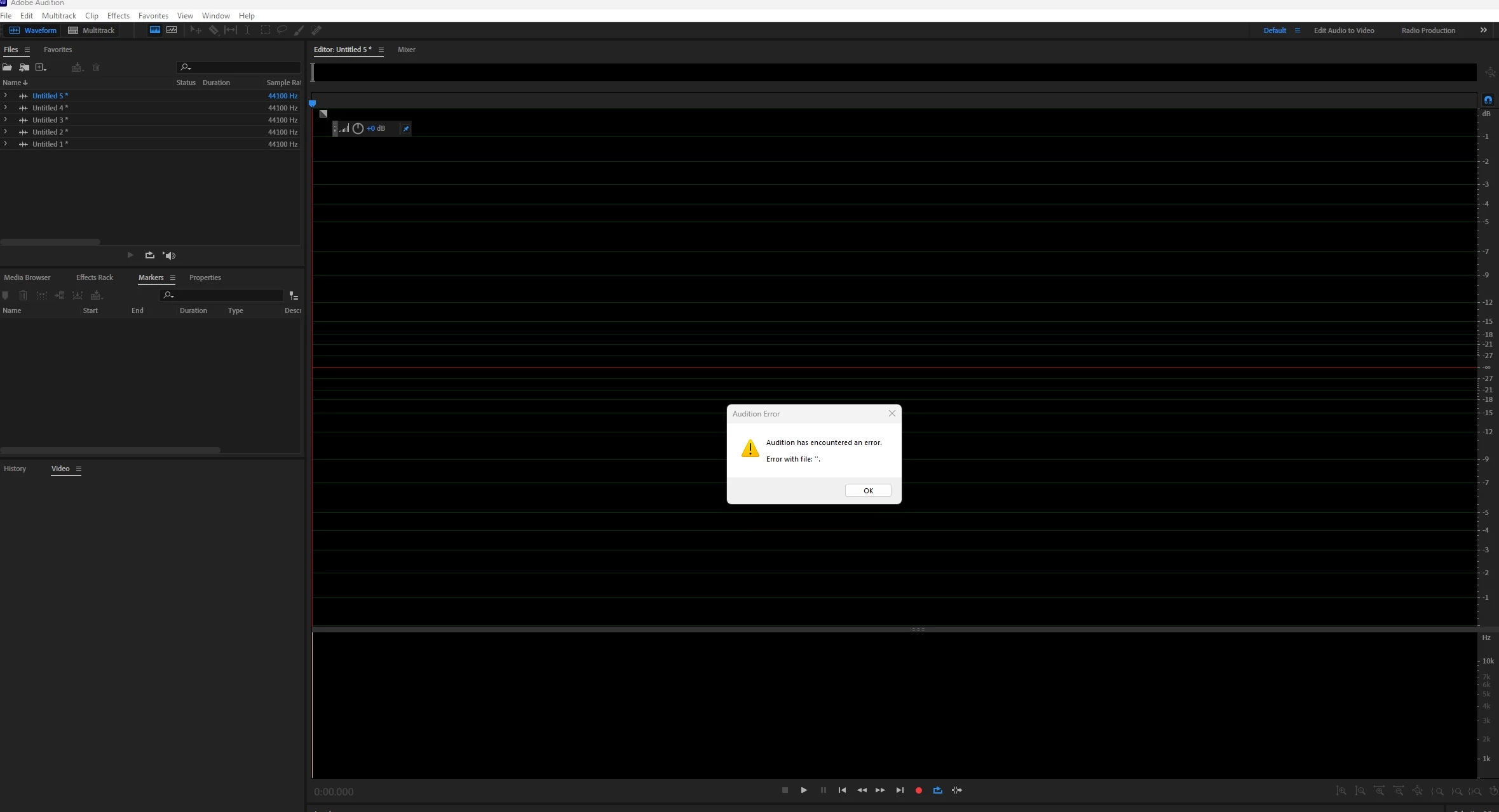 When I start a new audio file (Ctrl+Shift+N). I confirm my selection of 16 bits and 44100 and file name and I get this error (the file name will be the default "untitled")