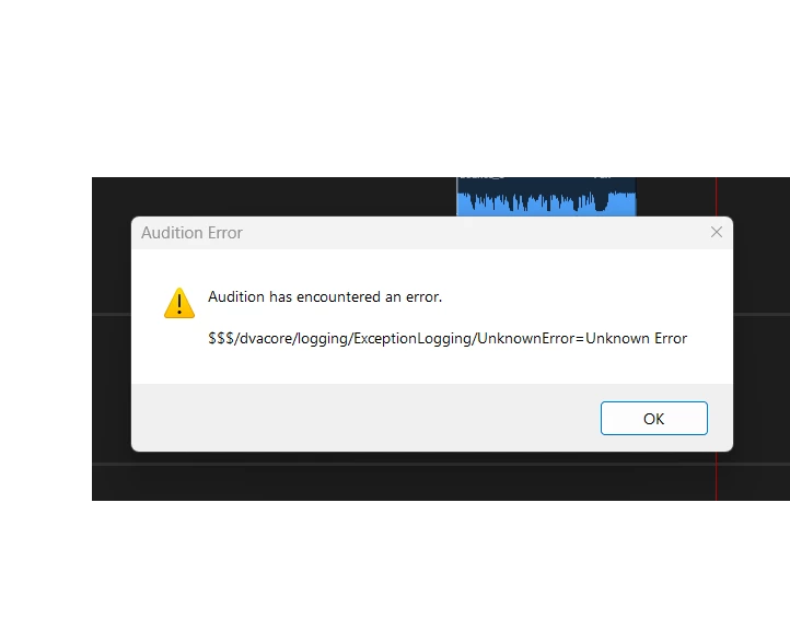 5) screenshot of the error message attached - "Audition has encountered an error. $$$/dvacore/logging/ExceptionLogging/UnknownError=Unknown Error"