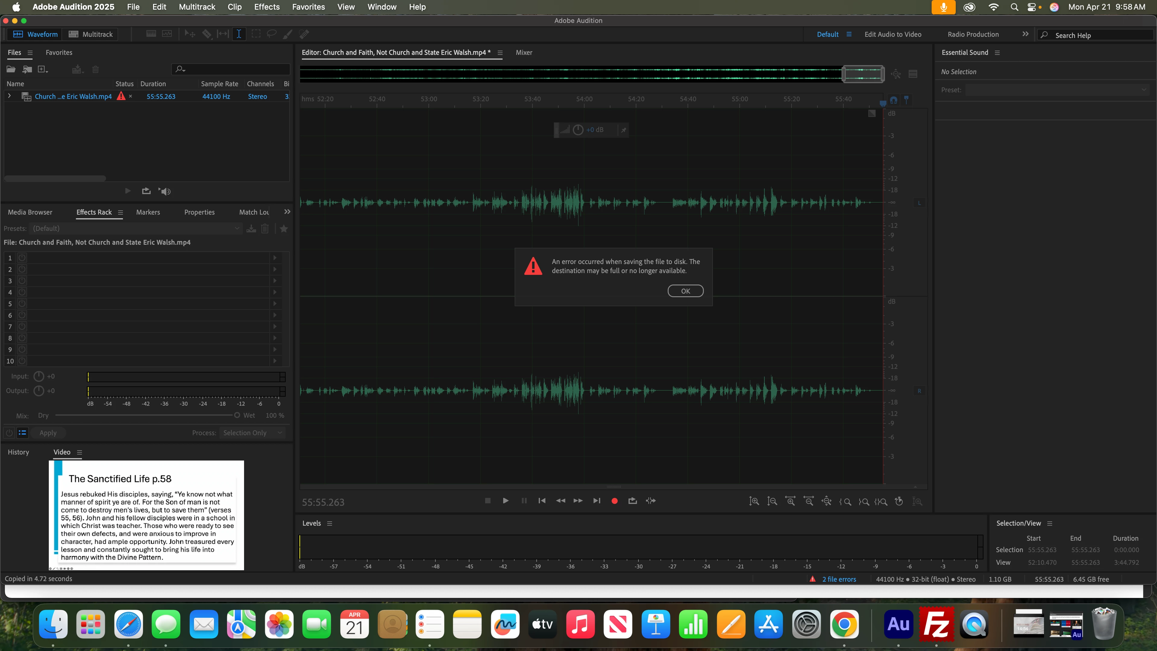 Hello. I am using Auditon 2025 and am no longer able to save or export projects. I am getting this error for the first time: An error occurred when saving the file to disk. The destination may be full or no longer available.
