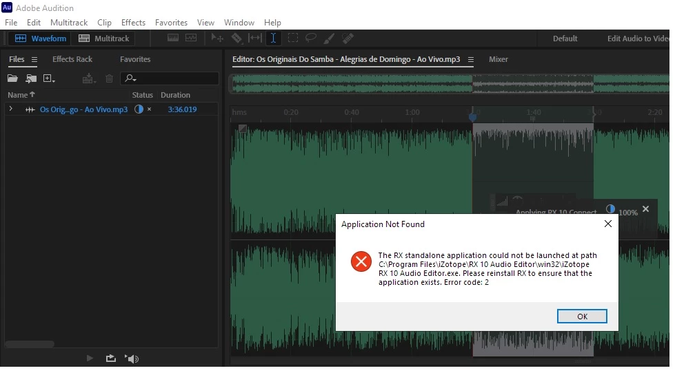 "Unable to launch the RX Standalone application at path C:\Program Files\RX 10 Audio Editor\win32\iZotope RX 10 Audio Editor.exe. Please reinstall RX to ensure the application exists. Error Code: 2"