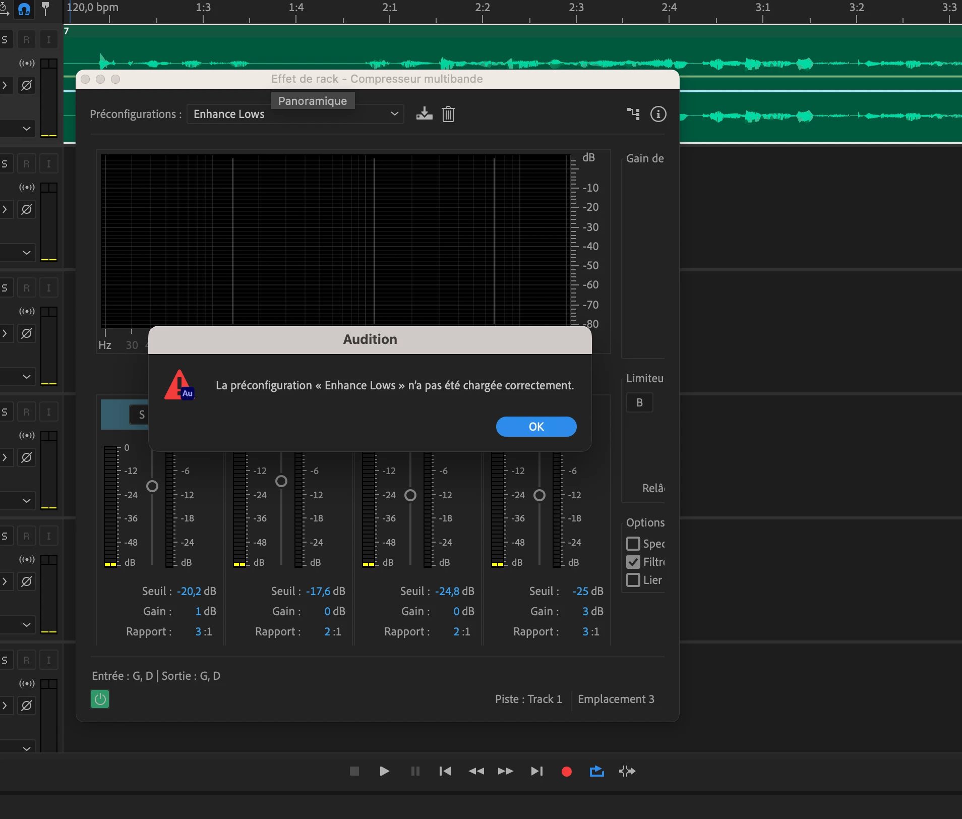 Je viens ici pour demander de l'aide en espérant enfin trouver une solution à mon problème. Voilà, depuis la mise à jour de Audition 2020 et dans toutes les versions ultérieures, je ne peux plus utiliser les effets internes. Actuellement j'utilise la version 2025 d'Audition. Quelques soit l'effet que j'essaie de charger un effet, j'ai systématiquement le message suivant qui s'affiche : La préconfiguration "nom de l'effet" n'a pas été chargée correctement. Dans la capture ci-joint vous pouvez voir que j'ai essayé d'appliquer l'effet "Enhance lows".