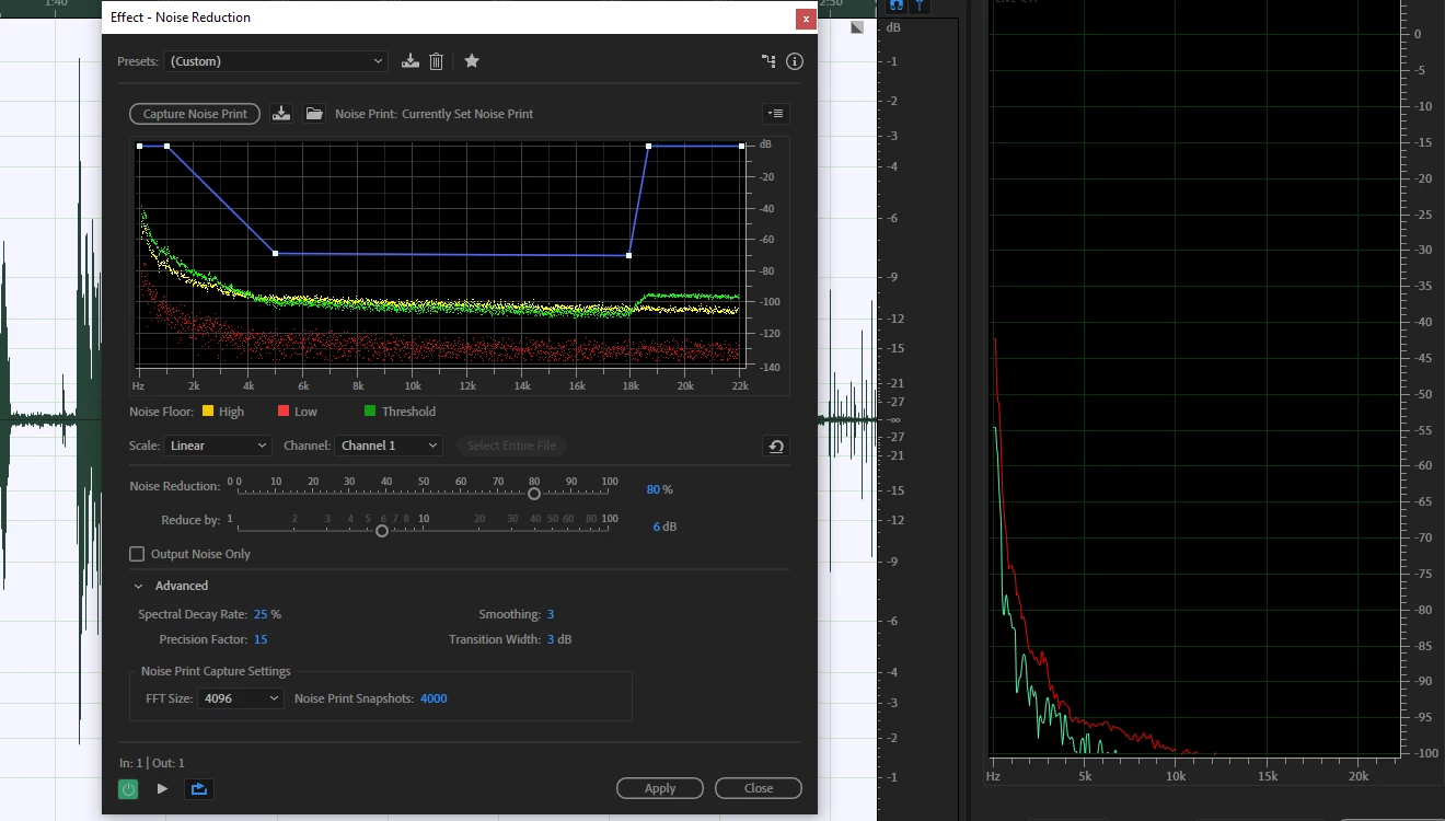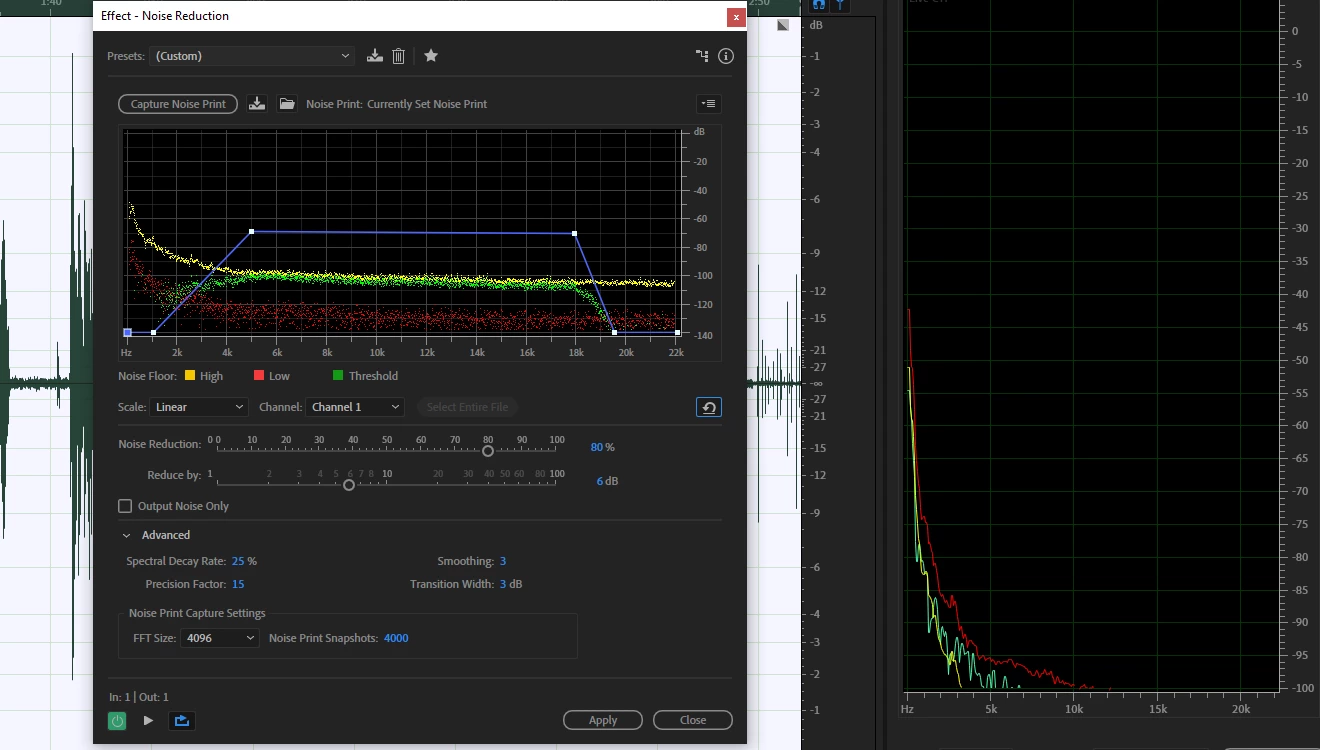 Once processed you can see in the waveform on the left as well as the frequencey analisis, that the baseline noise has been reduced. (Red is the unprocessed, Yellow is processed in the Frequencey Analysis tool )