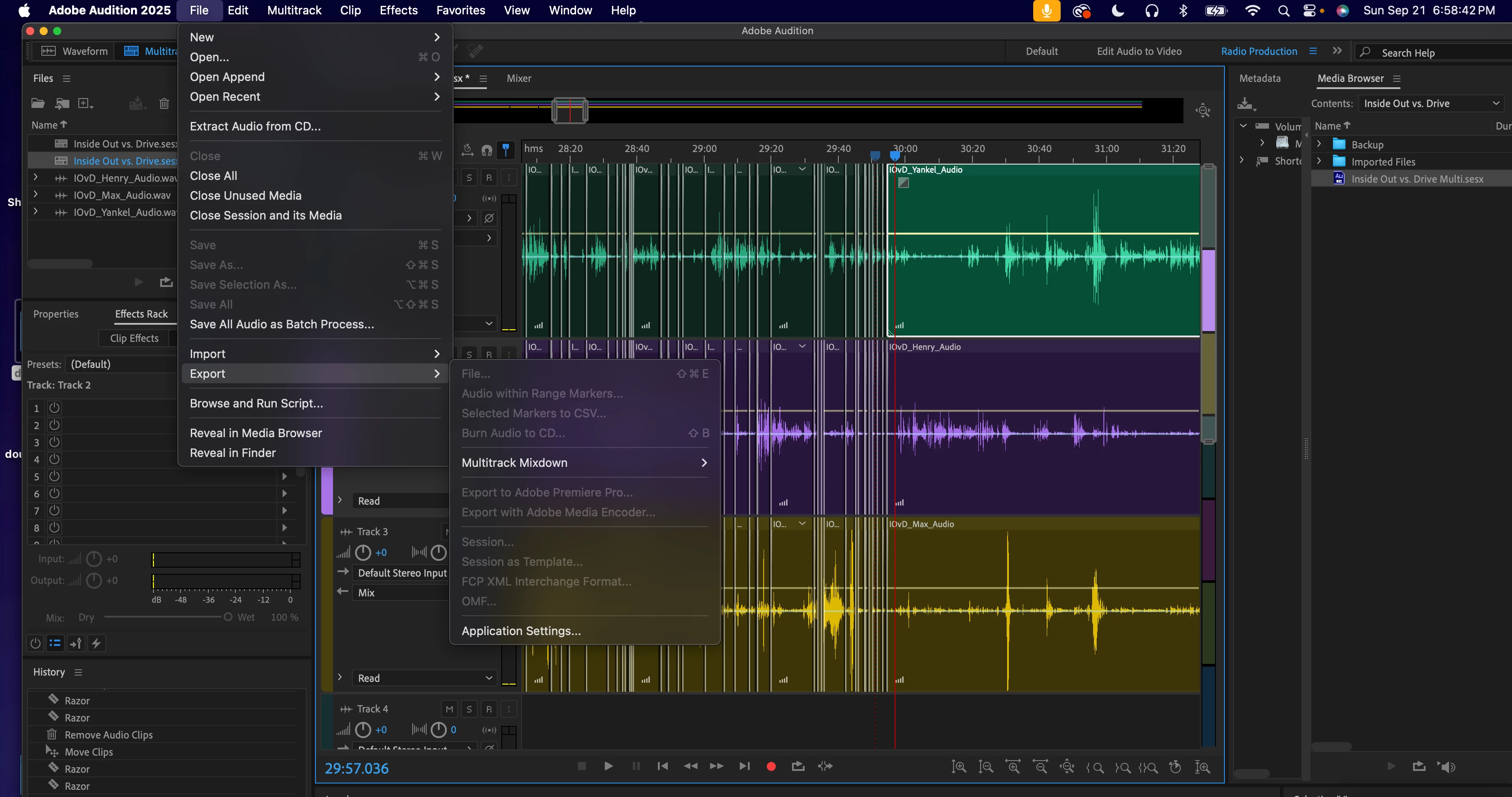 I would really appreciate any help with a matter. I'm editing a project in Audition and I was just command S-ing when I noticed it didn't lead to any saving. Then I checked the file bar and all three save buttons were greyed out. Then tried to export to save my progress and the export multitrack is greyed out. I tried finding similar problems but all the results didn't solve my problem. Most were solved by the output not being in Mix but all of my outputs are in Mix. The closest problem I saw mentioned was that I had two sesx files with the same name, but I have no idea if that is the problem or how to change the name, as I tried changing the name of the original file, but it didn't change it in Audition.